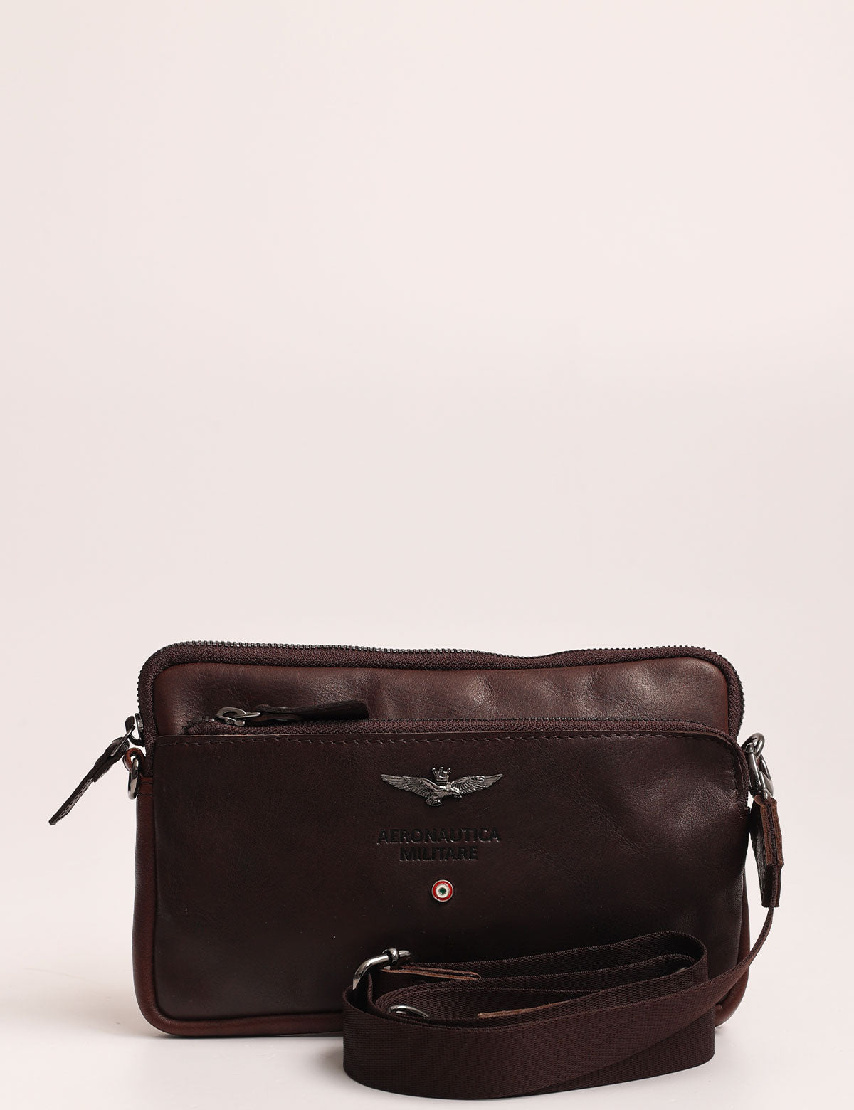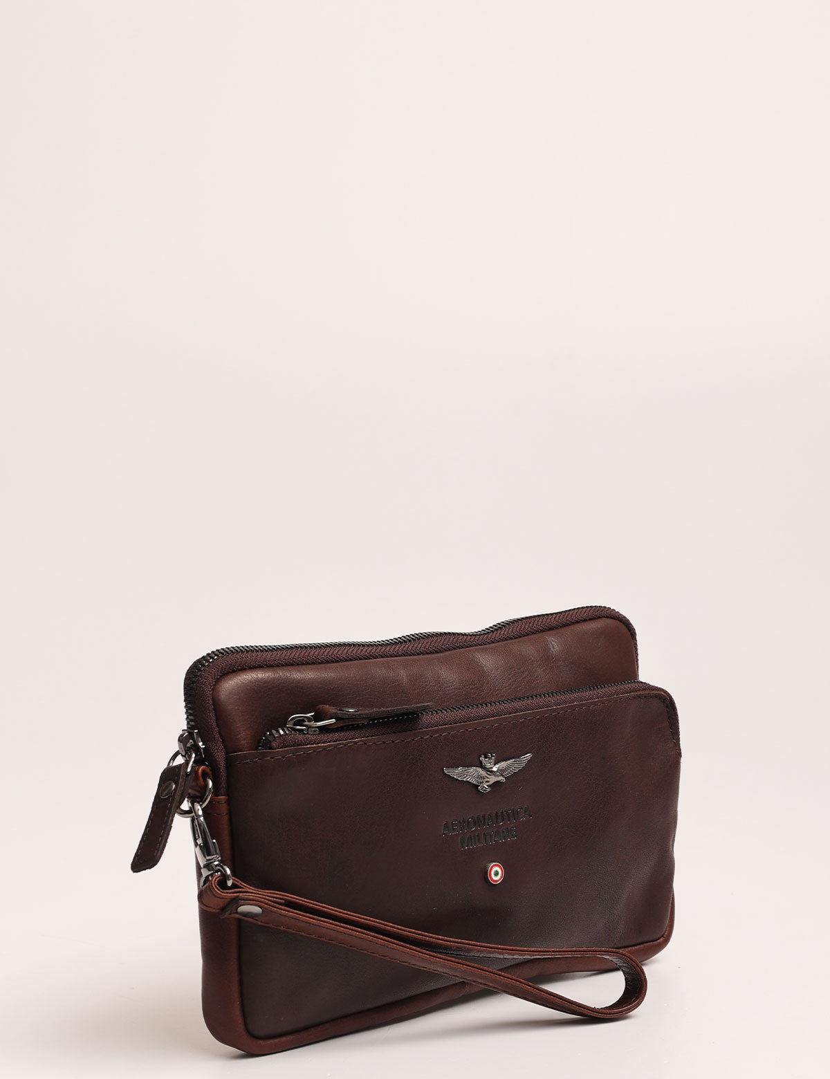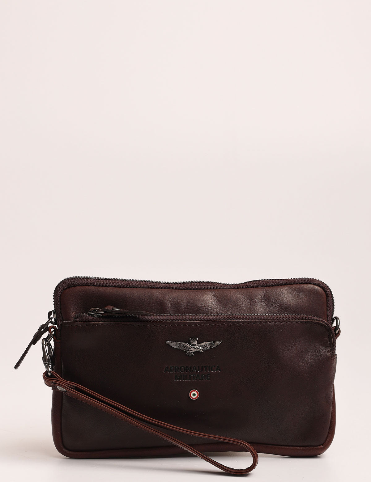 Herren-Clutch aus Leder von Aeronautica Militare , Innenausstattung aus blauem Polyester mit Gunmetal-Logo und Accessoires. Die besondere Verarbeitung des Leders verleiht dem Produkt einen faszinierenden und zeitlosen Geschmack, typisch für den Vintage -Stil. Die Clutch wird mit Schultergurt und Handschlaufe geliefert.