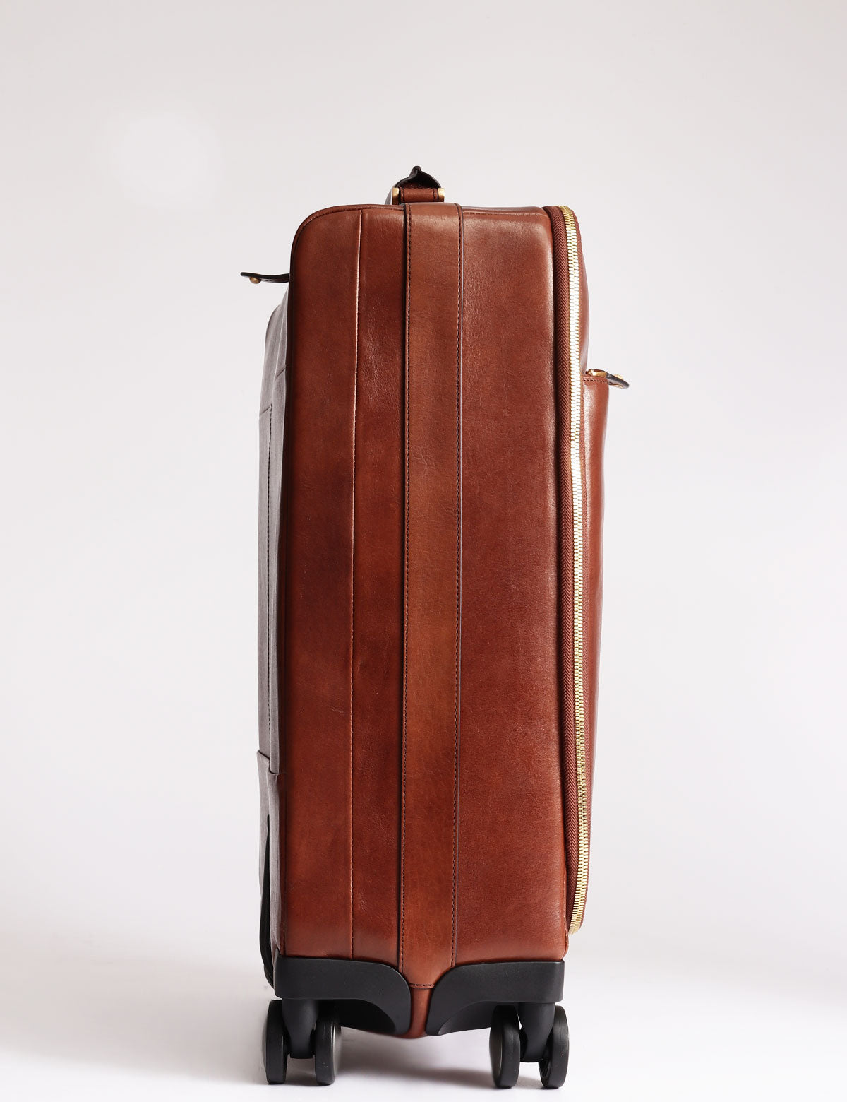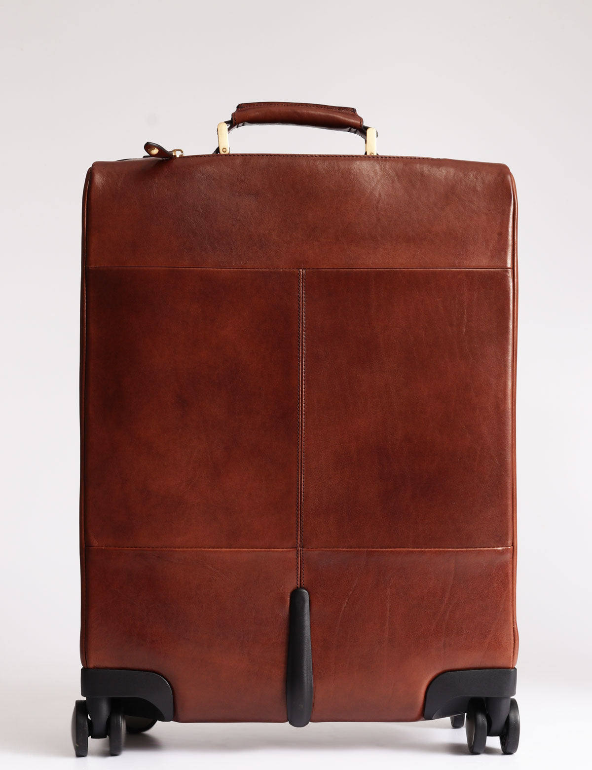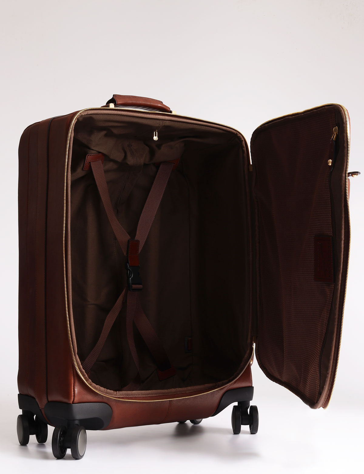 Das Bridge-Handgepäck aus Leder mit Vordertasche und vier leichtgängigen Rollen. Stoffinnenseite mit Kleidergurten