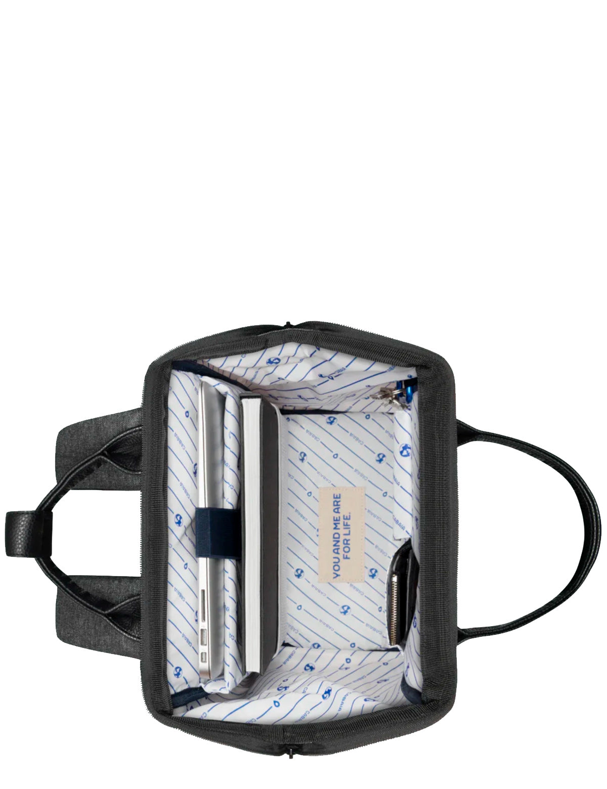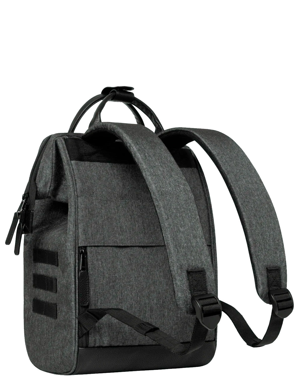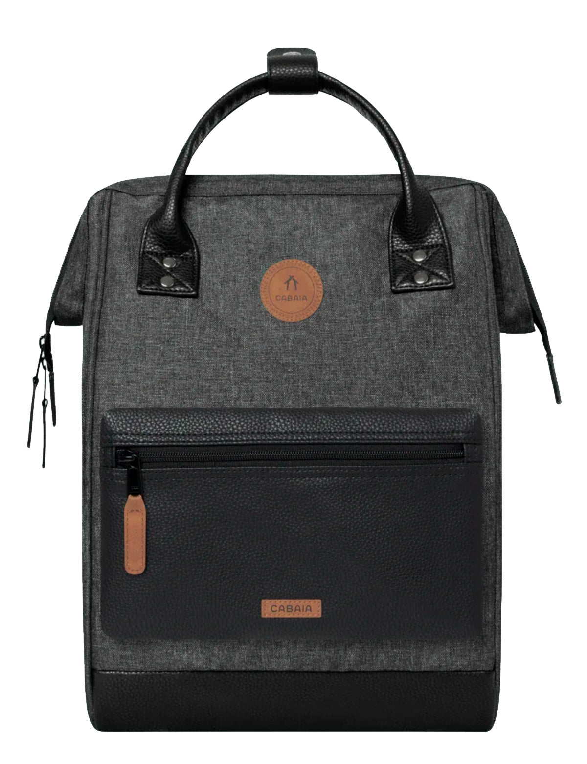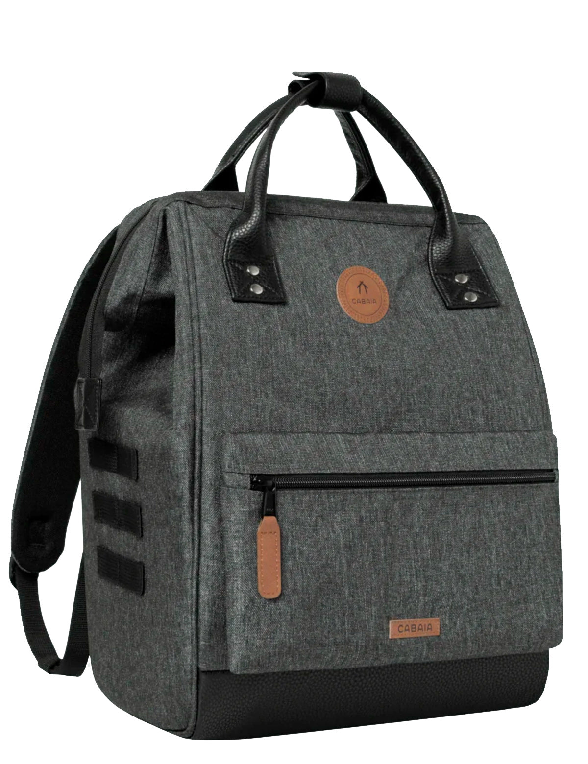 Cabaia-Stoffrucksack mit spezieller Weitwinkel-Oberöffnung und austauschbarer Vordertasche. Hergestellt aus recycelten Materialien.
