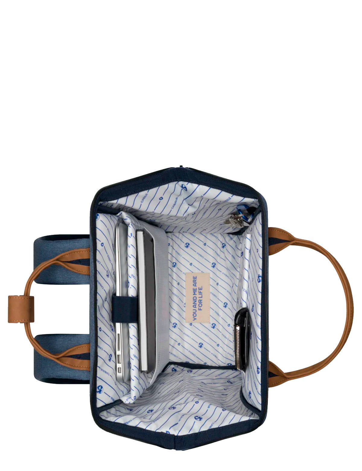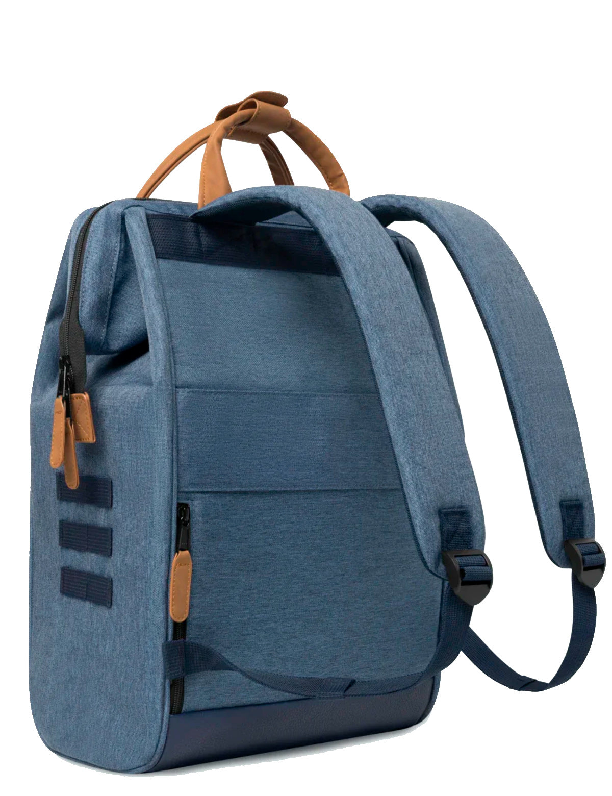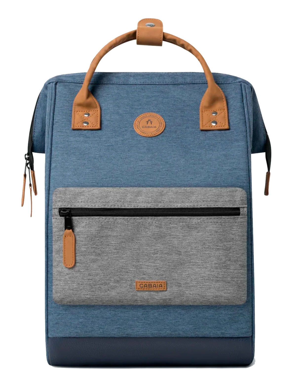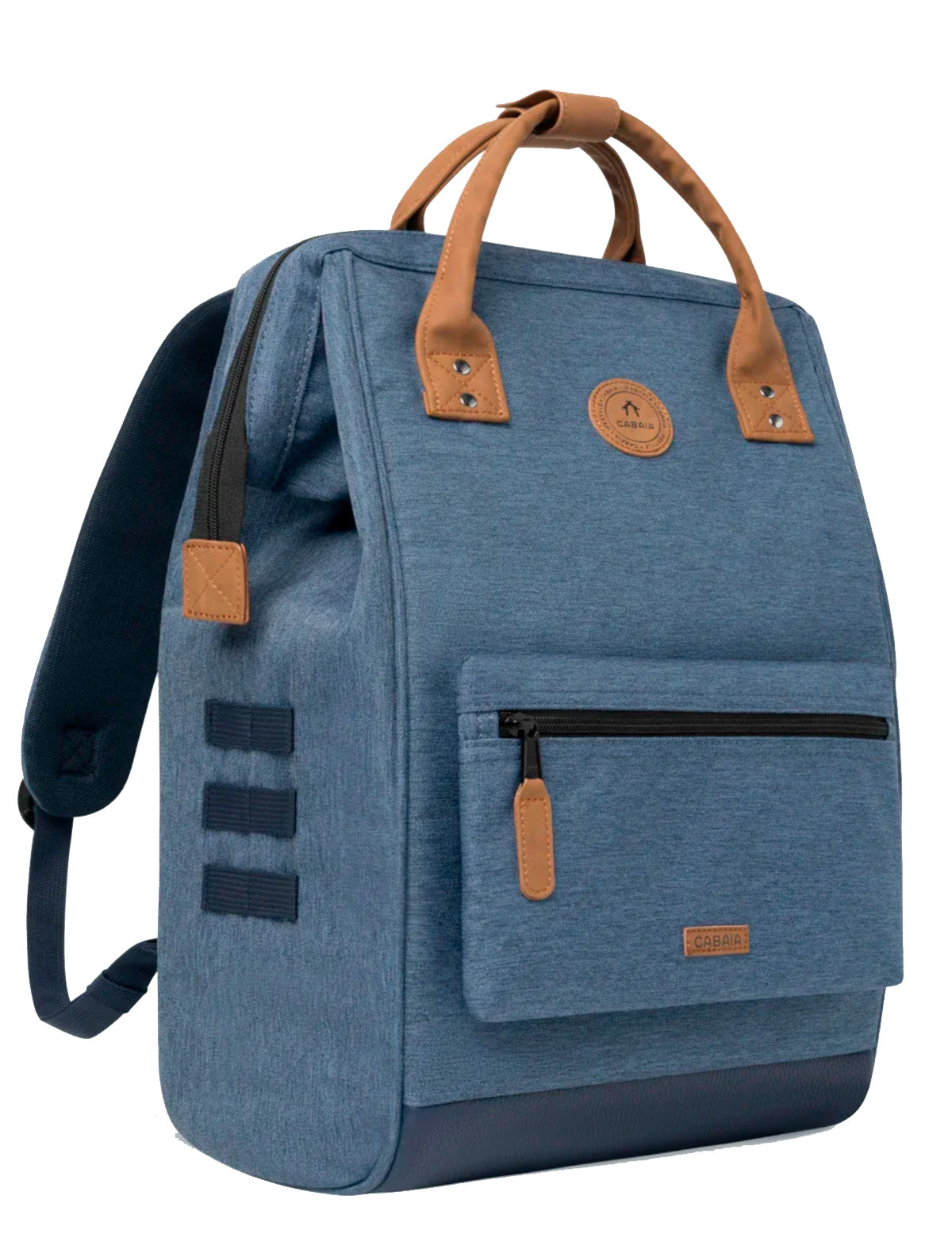 Cabaia-Stoffrucksack mit spezieller Weitwinkel-Oberöffnung und austauschbarer Vordertasche. Hergestellt aus recycelten Materialien.