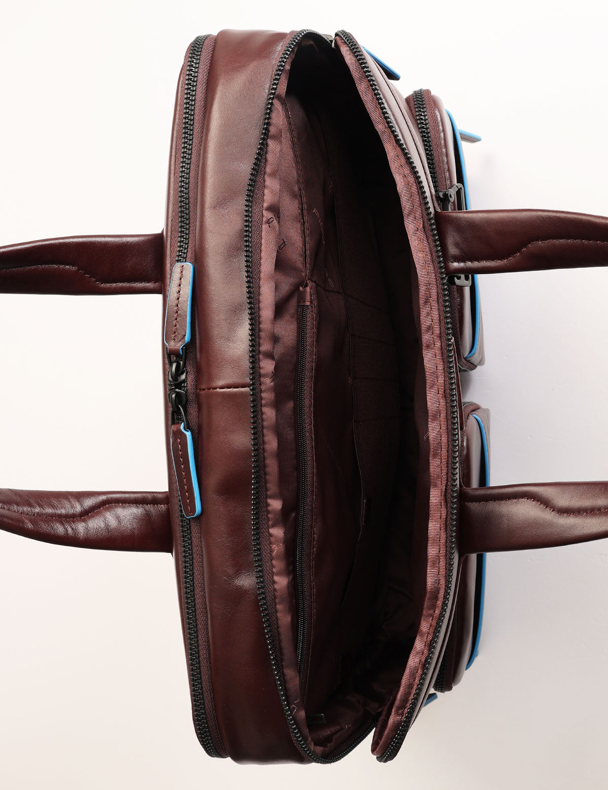 Piquadro work bag model with two compartments for a PC up to 15.6" and a tablet up to 12.9" with two handles, made of leather.