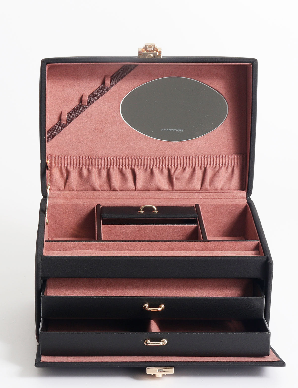 Friedrich23 jewelry box in an elegant contrasting black and plum color, with internal compartments for all kinds of jewelry and three drawers