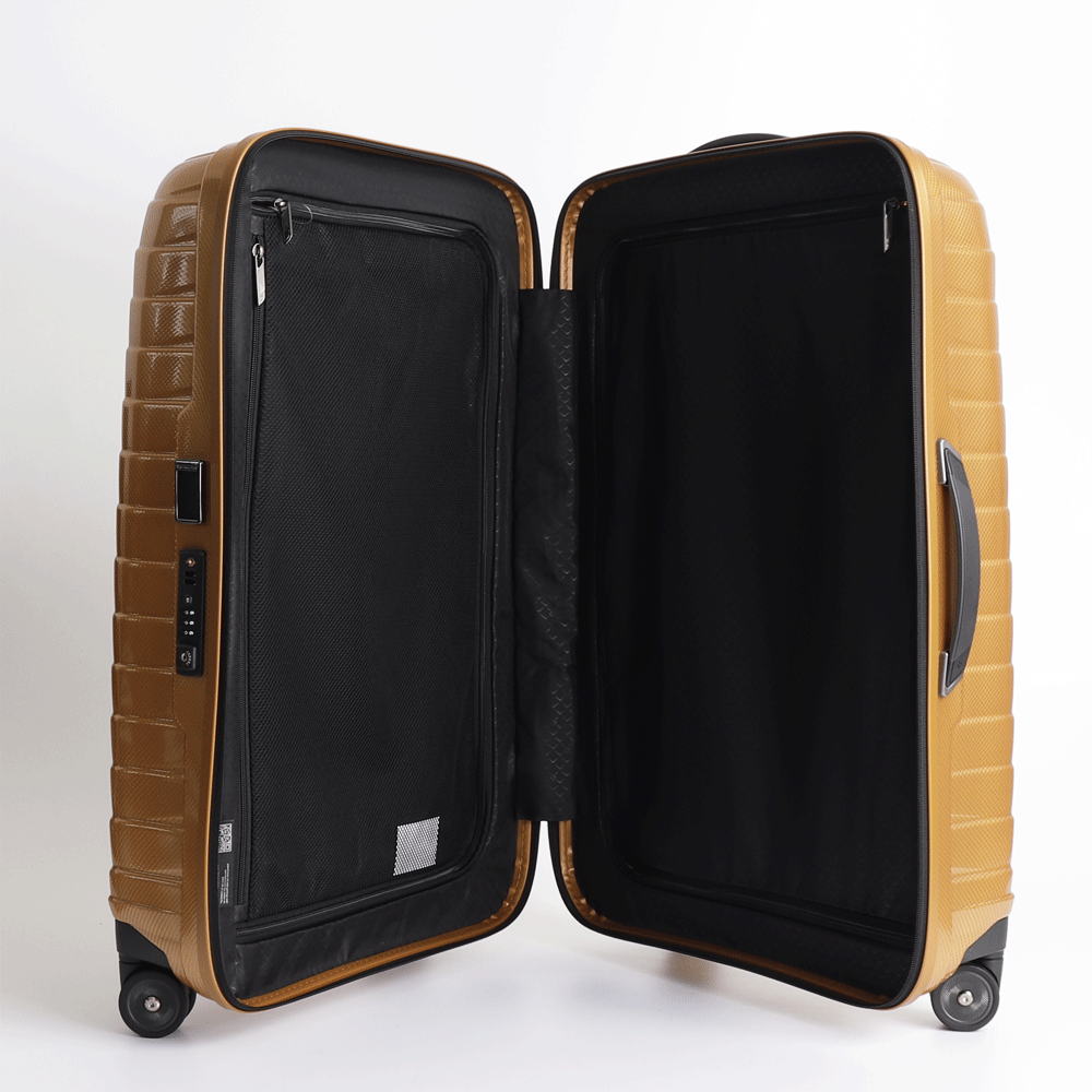 Samsonite medium-sized hold luggage, hard-shell model made of Roxkin, a highly resistant and multilayered material and equipped with accurate internal organisation.
