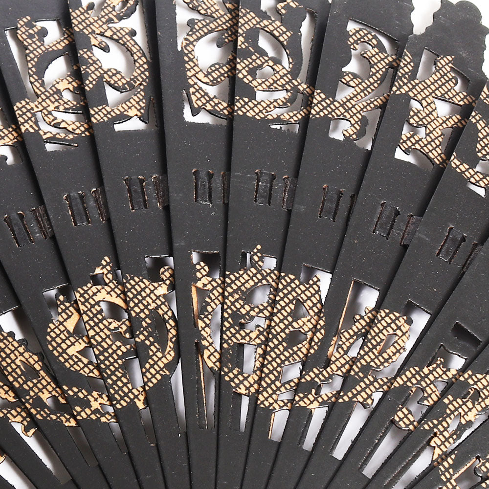 Vera Pilo women's fan, handcrafted from painted and chiseled wood with cotton fabric. Length when closed: 21 cm, width when open: 29 cm.