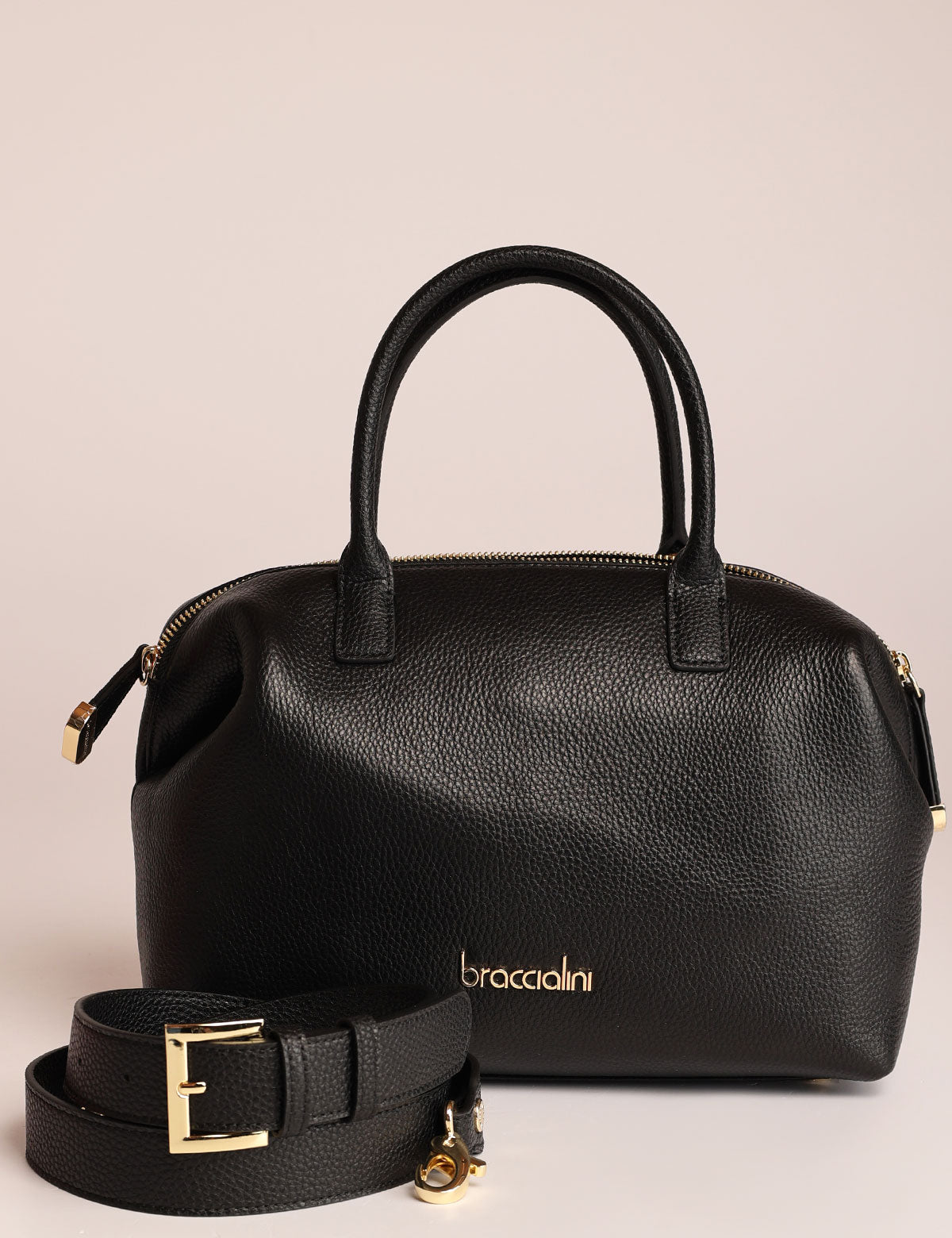 The Braccialini Sara bag line is made entirely of leather, characterised by a simple and elegant design and small, striking chrome details.