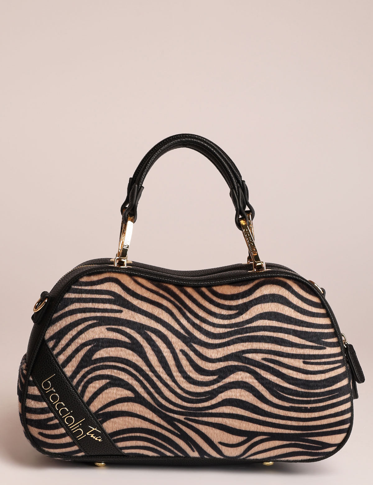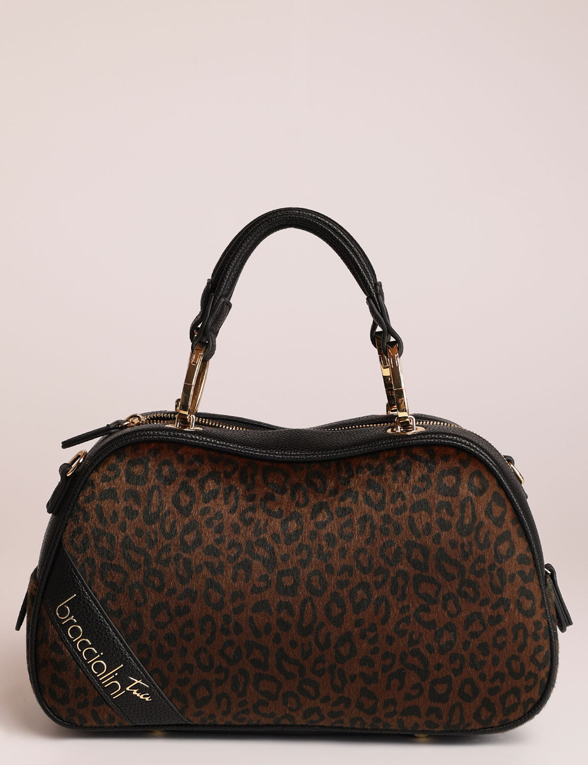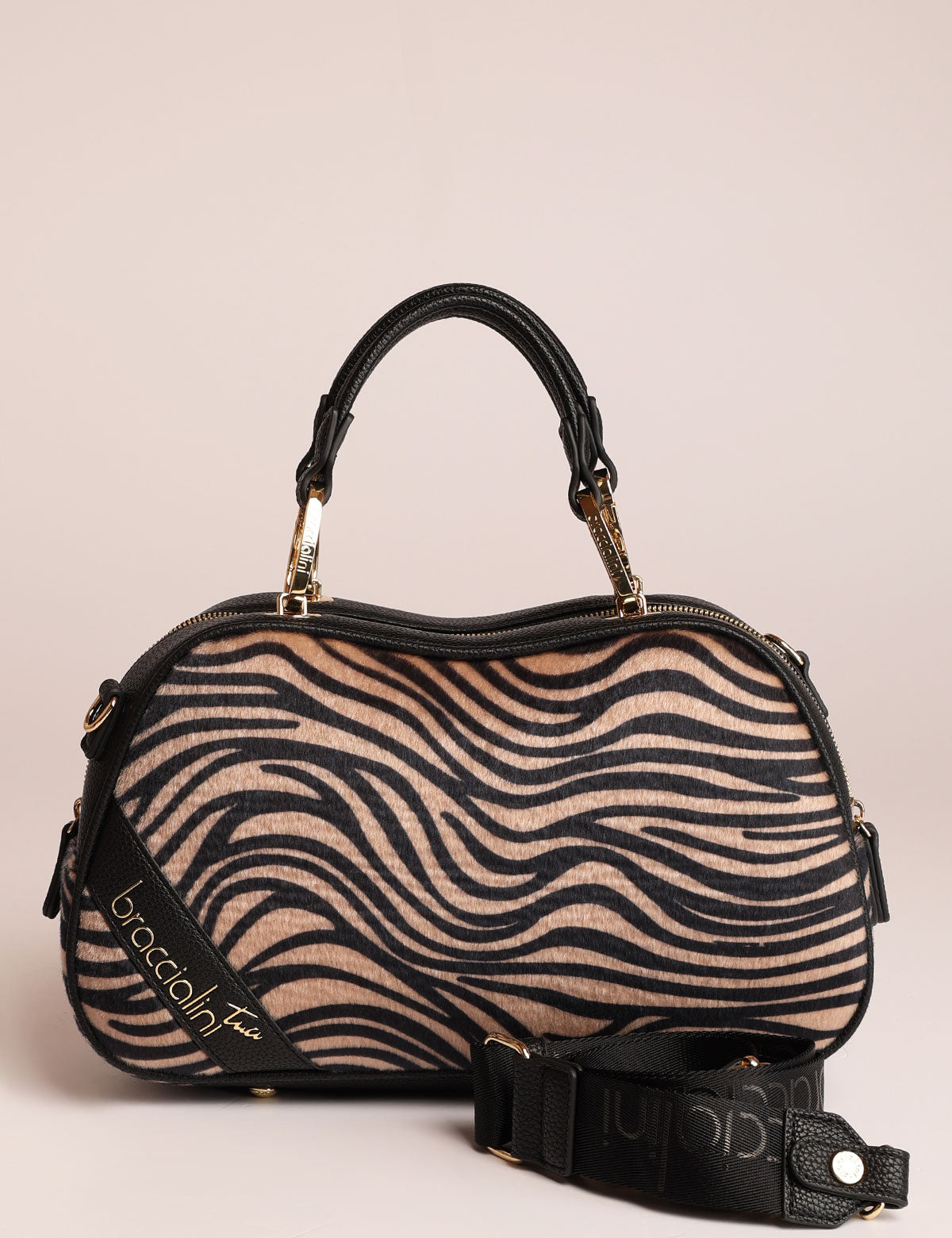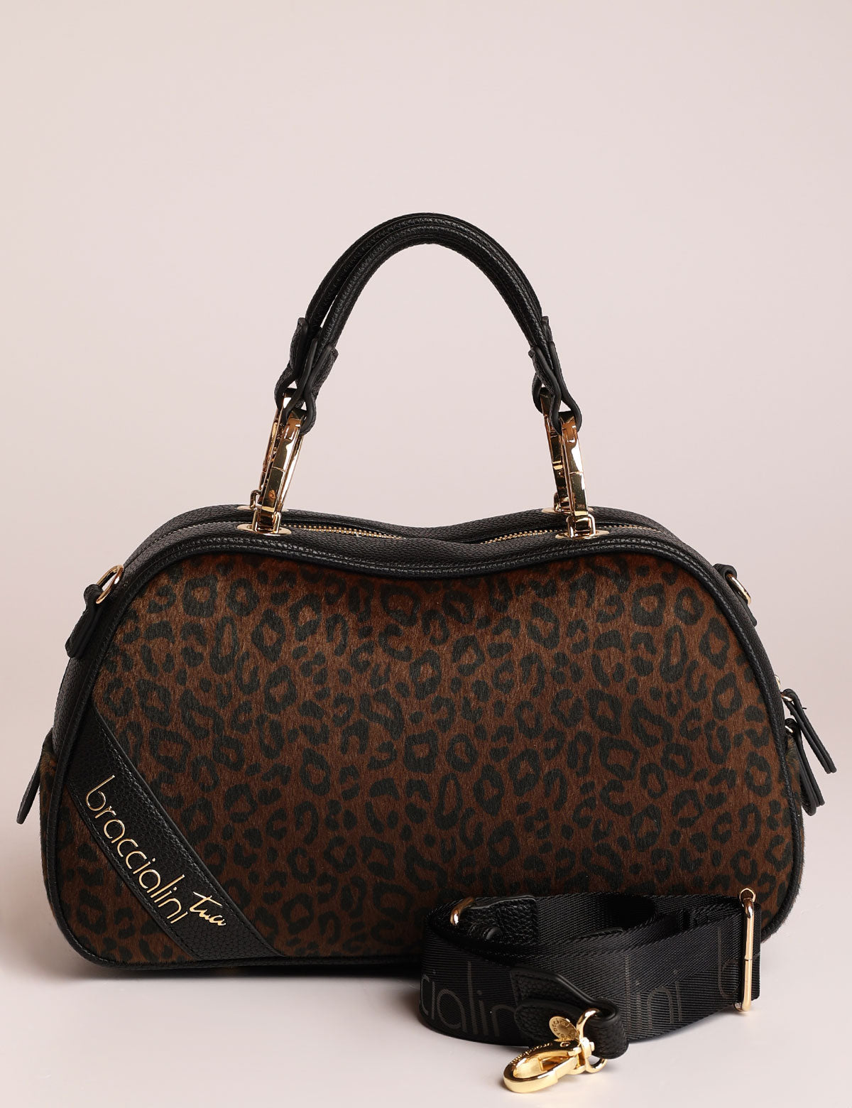 Braccialini women's handbag, trunk style, with animalier ponyskin finish and logo fabric shoulder strap