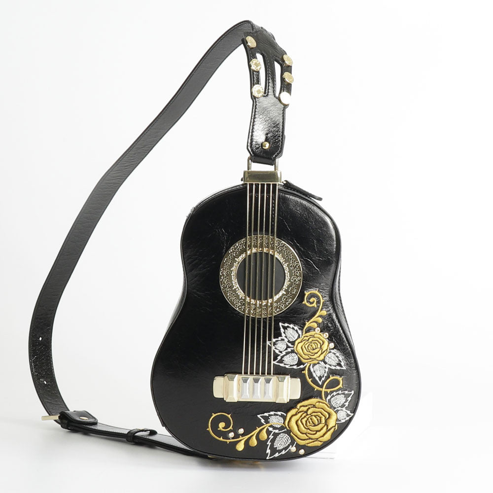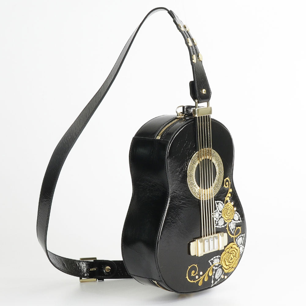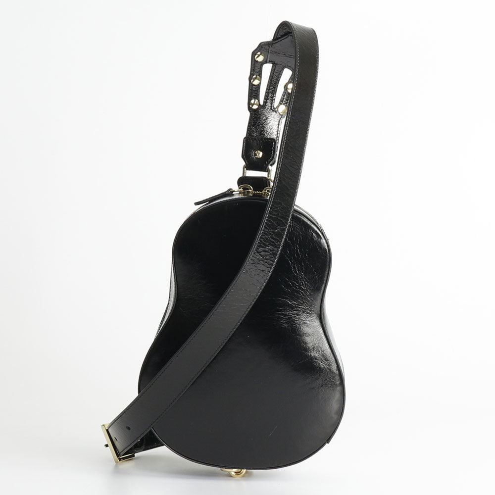 Braccialini women's bag in patent leather with shoulder strap and zip closure in the particular shape of a guitar rich in every detail