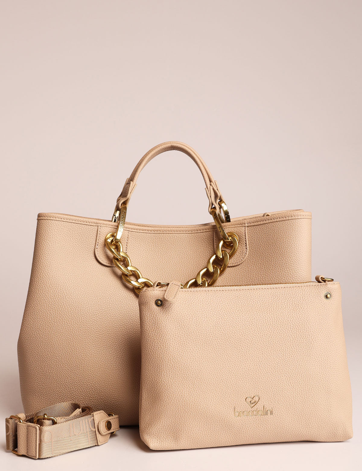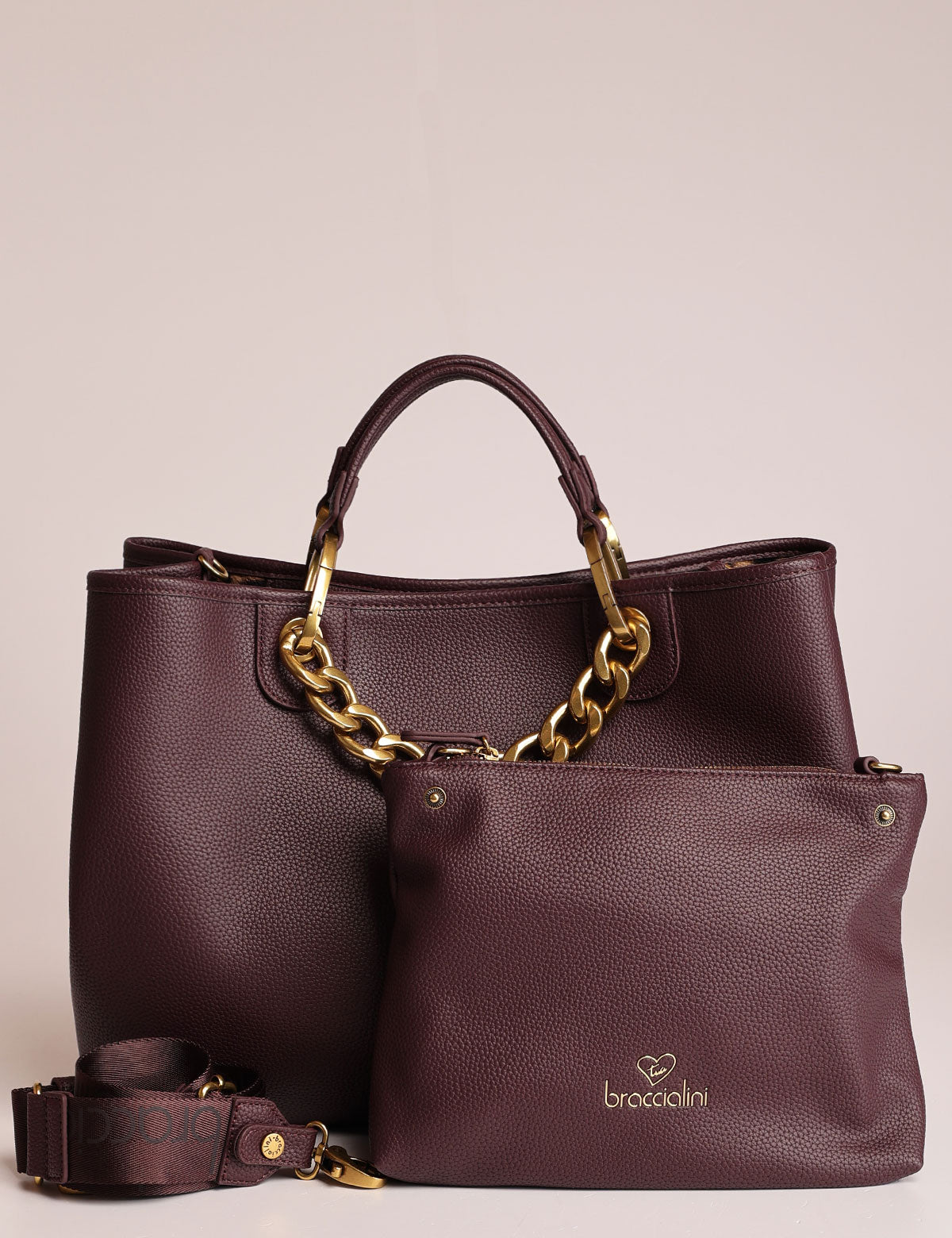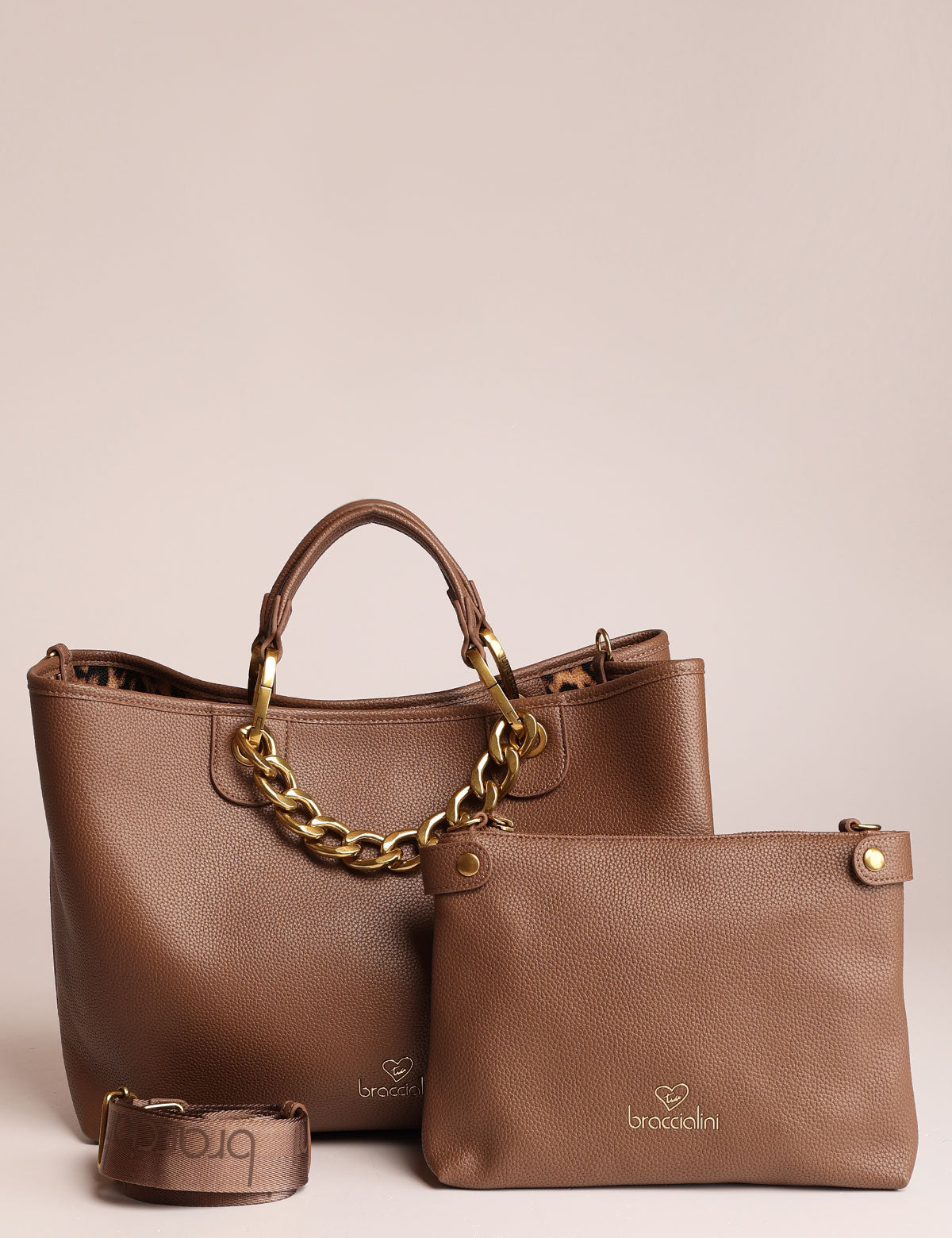 Braccialini women's handbag with chain handles and removable pouch that can also be worn as a shoulder bag