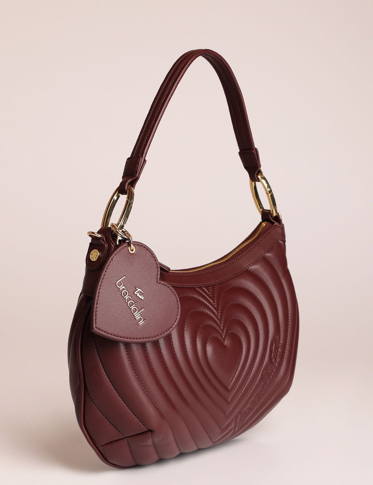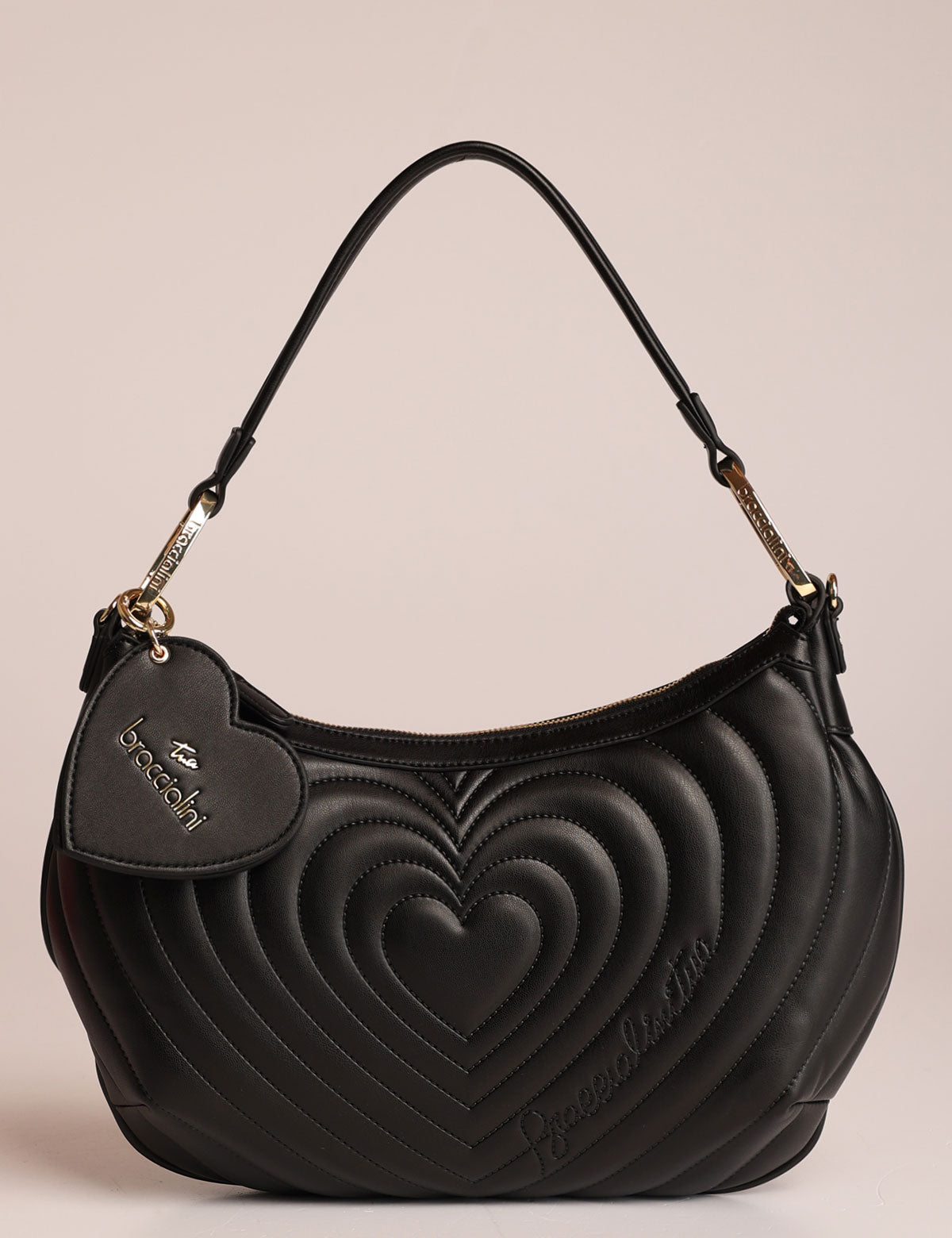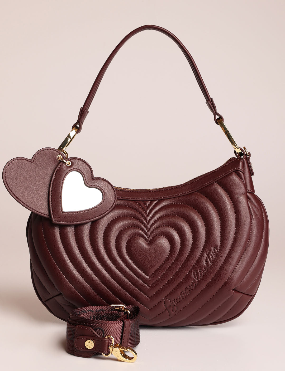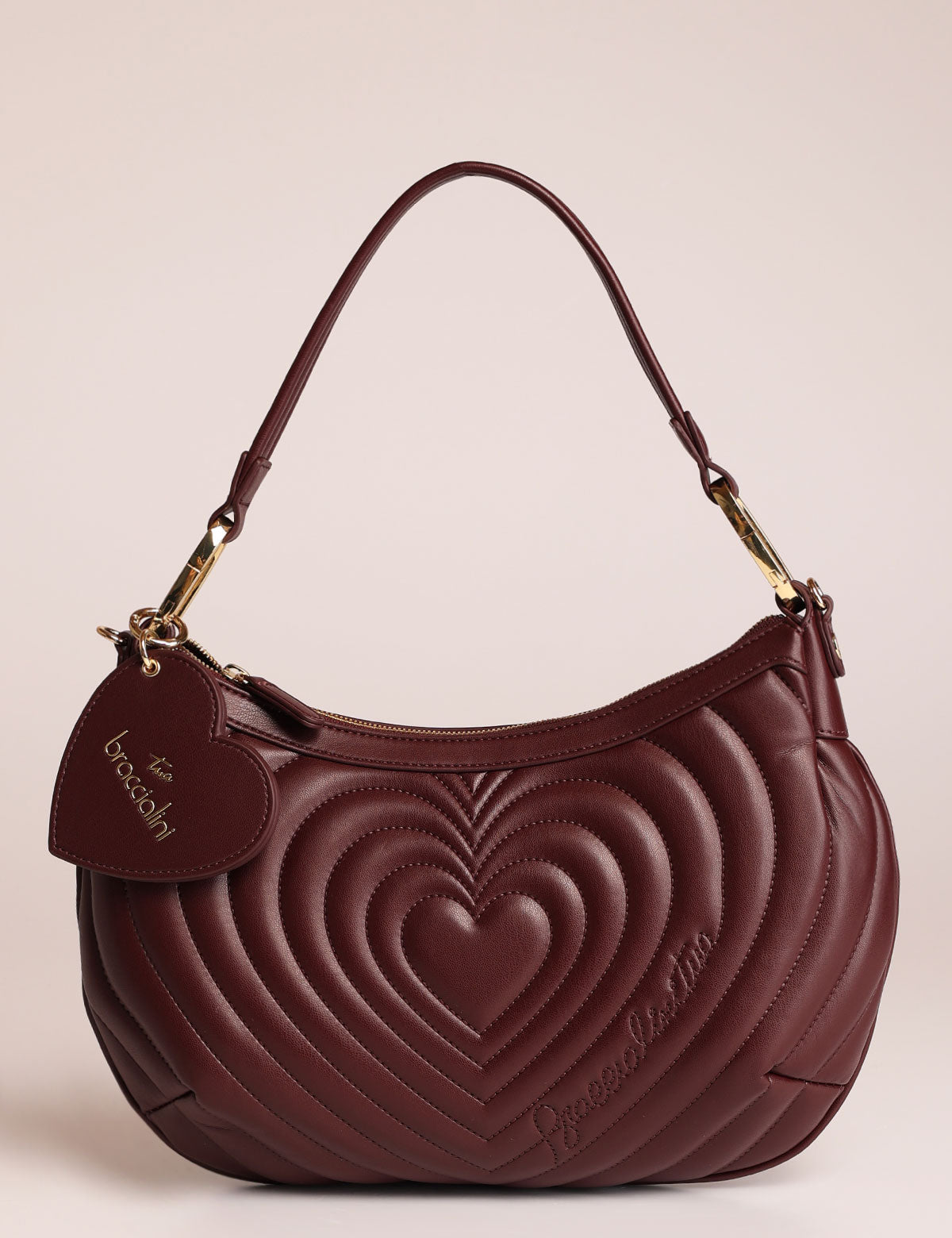 Braccialini women's shoulder bag with quilted exterior featuring a heart-shaped design and a heart-shaped mirror charm
