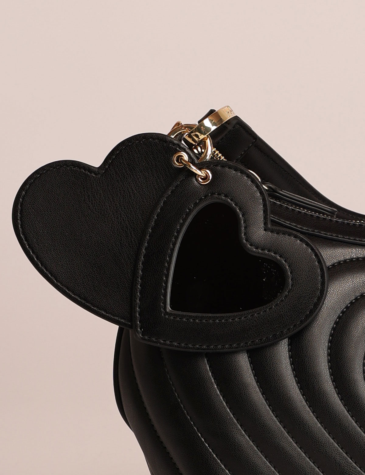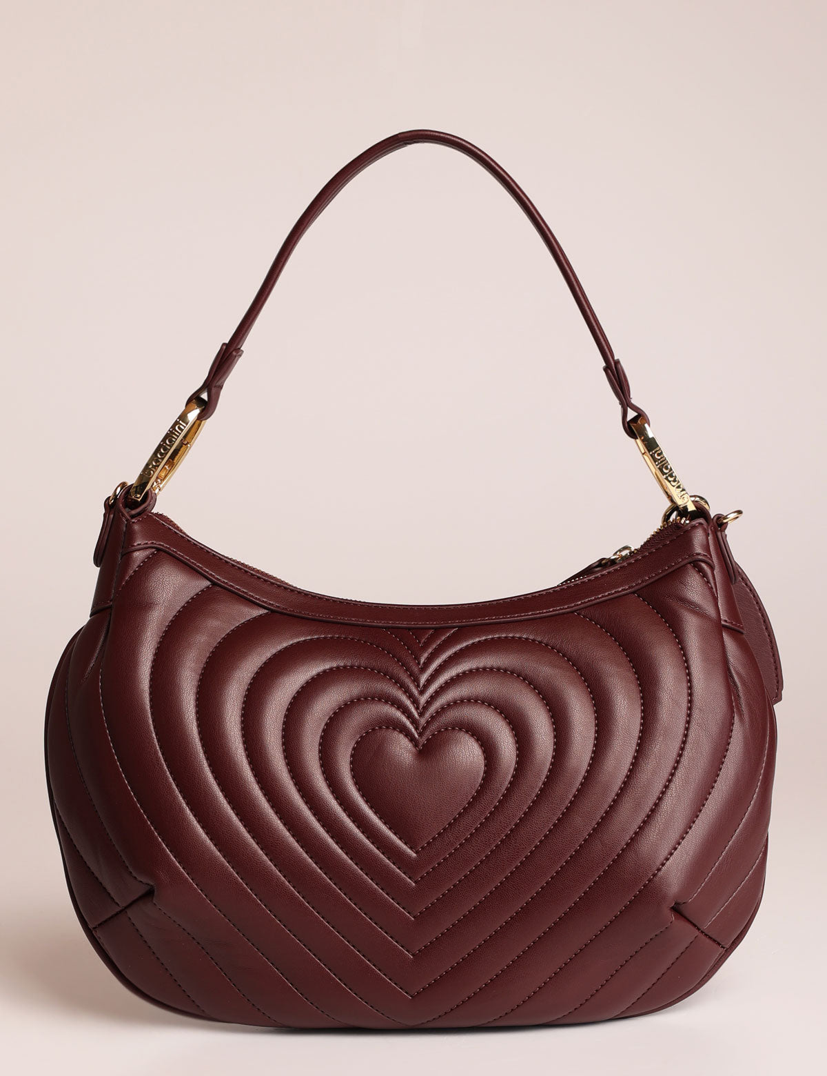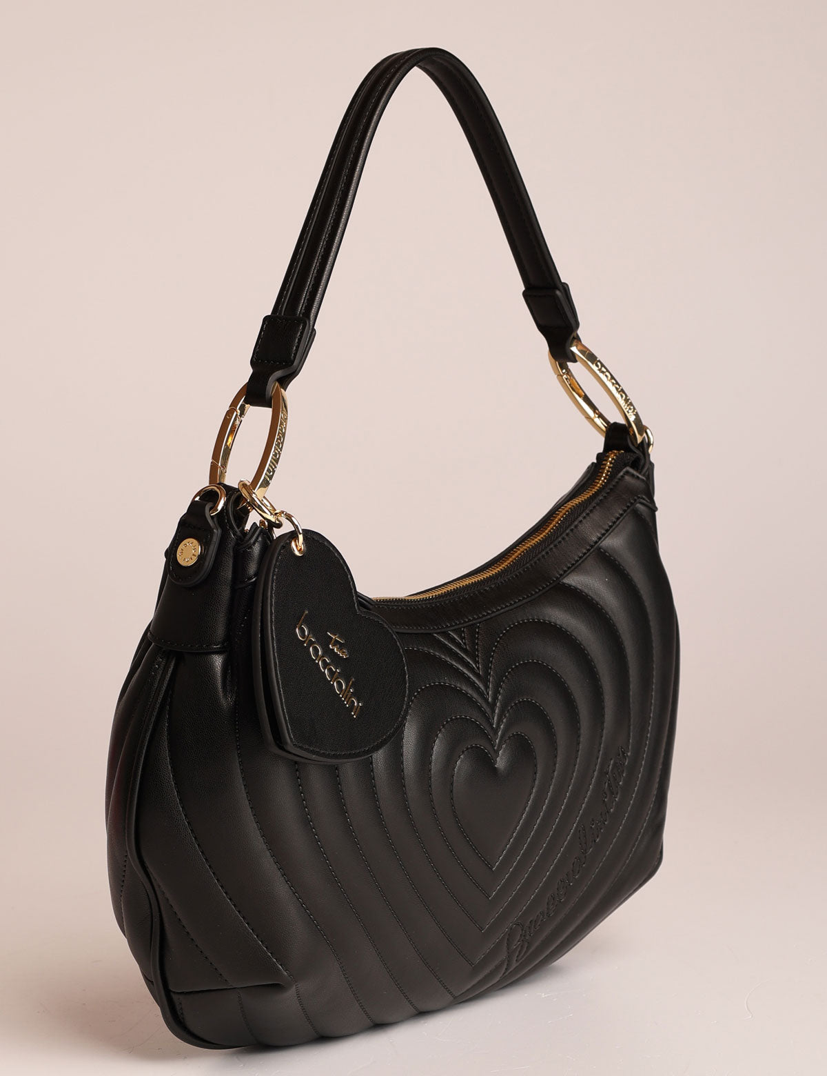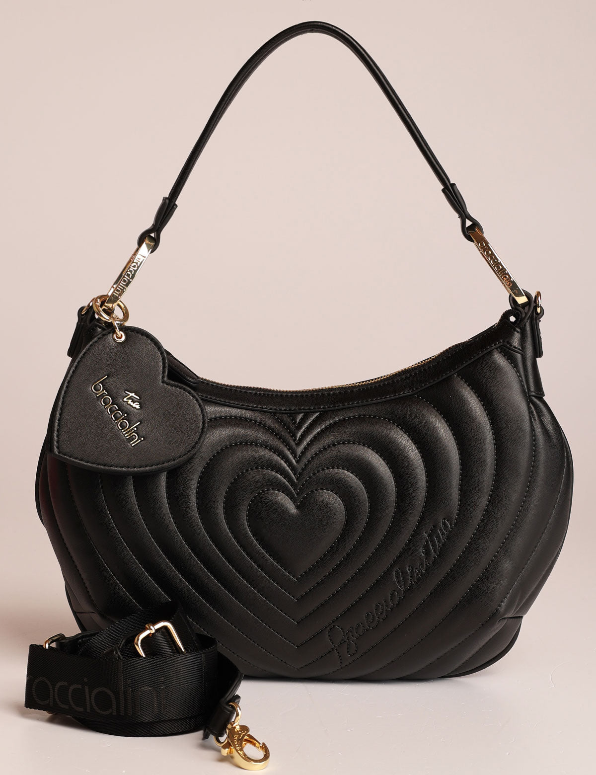 Braccialini women's shoulder bag with quilted exterior featuring a heart-shaped design and a heart-shaped mirror charm