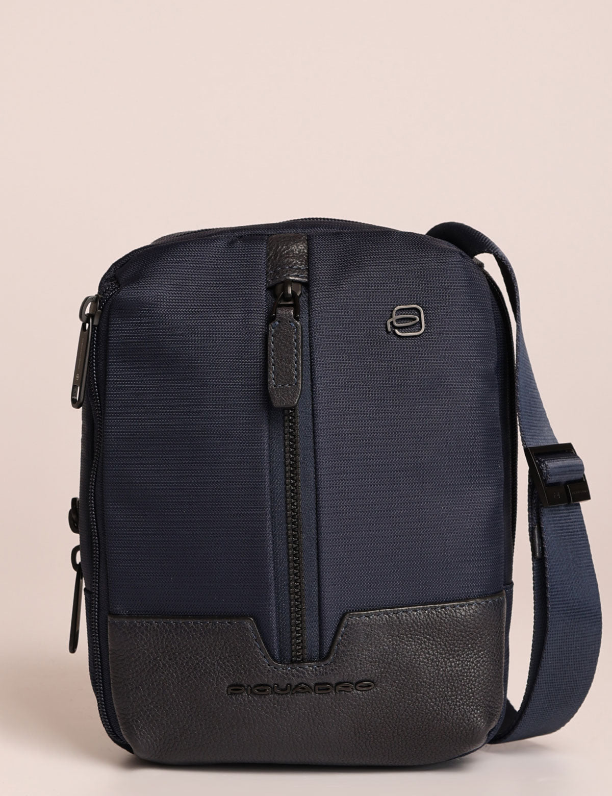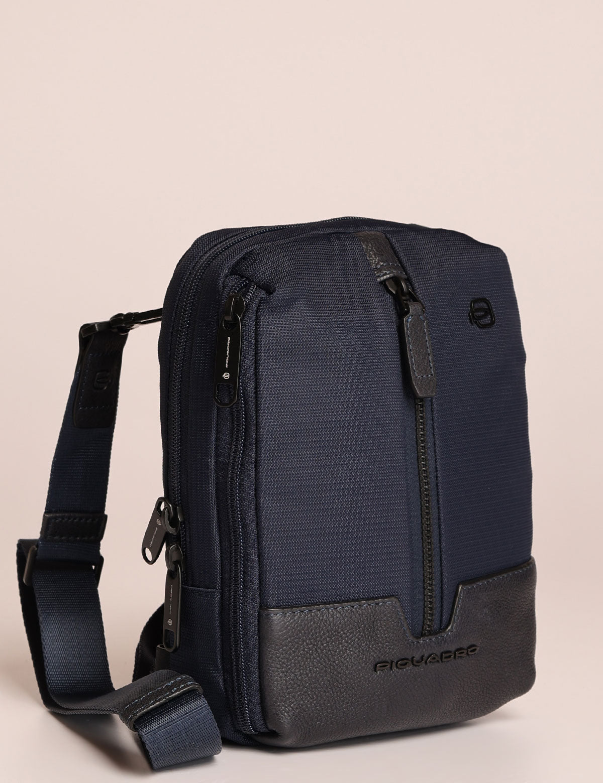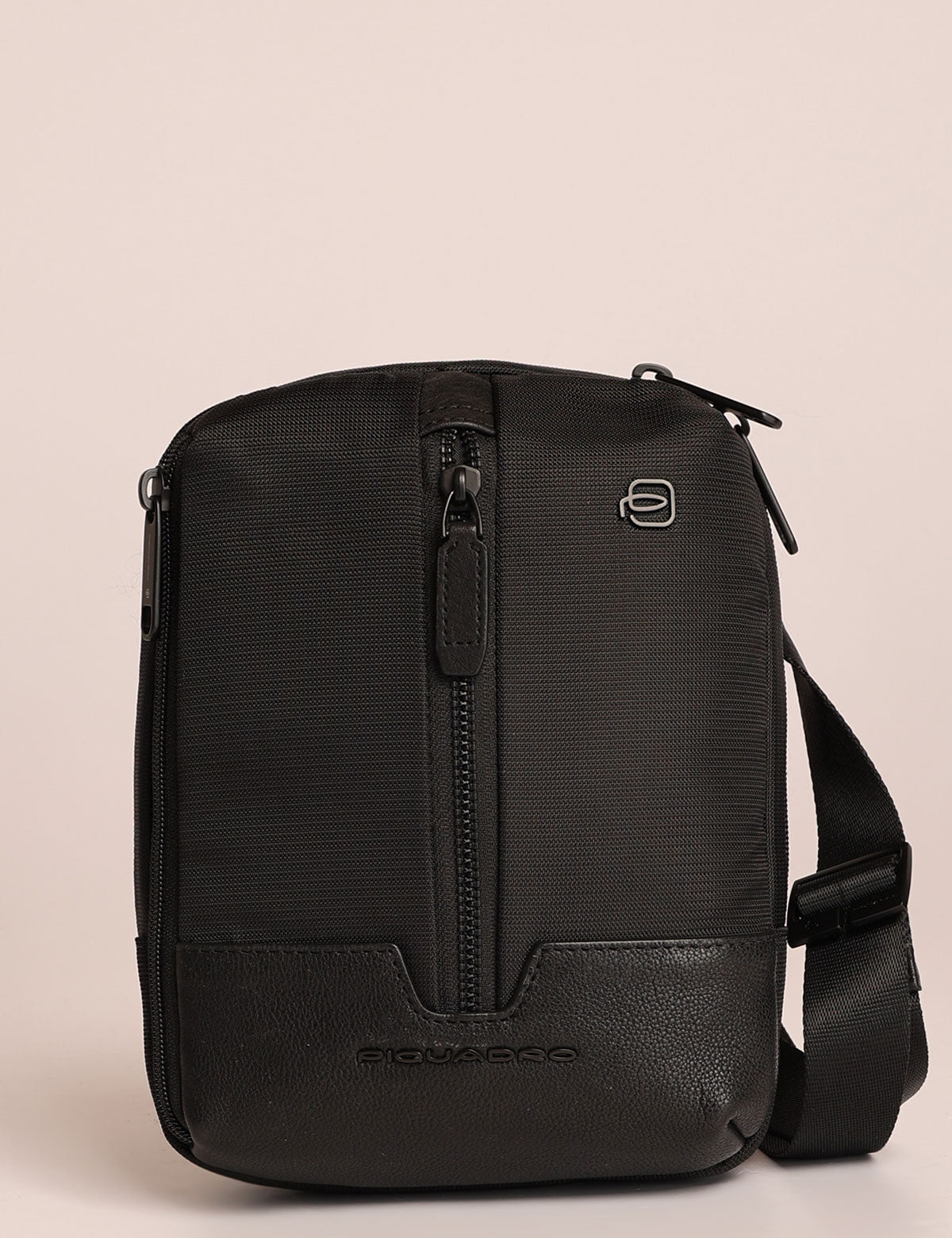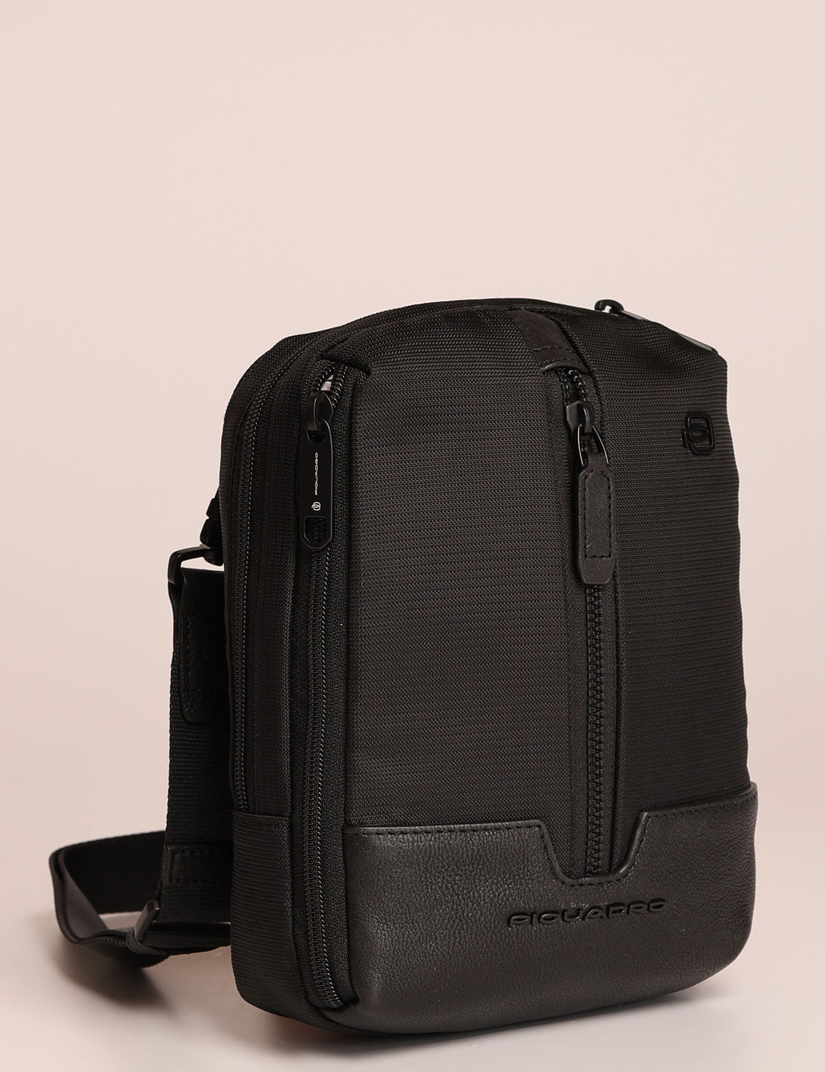 Tracolla da uomo Piquadro realizzata in tessuto riciclato e dettagli in pelle, modello con porta iPad Mini e pratica tasca frontale verticale