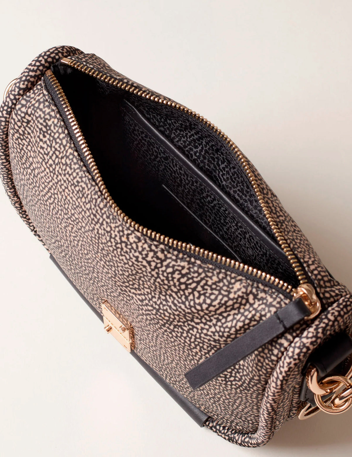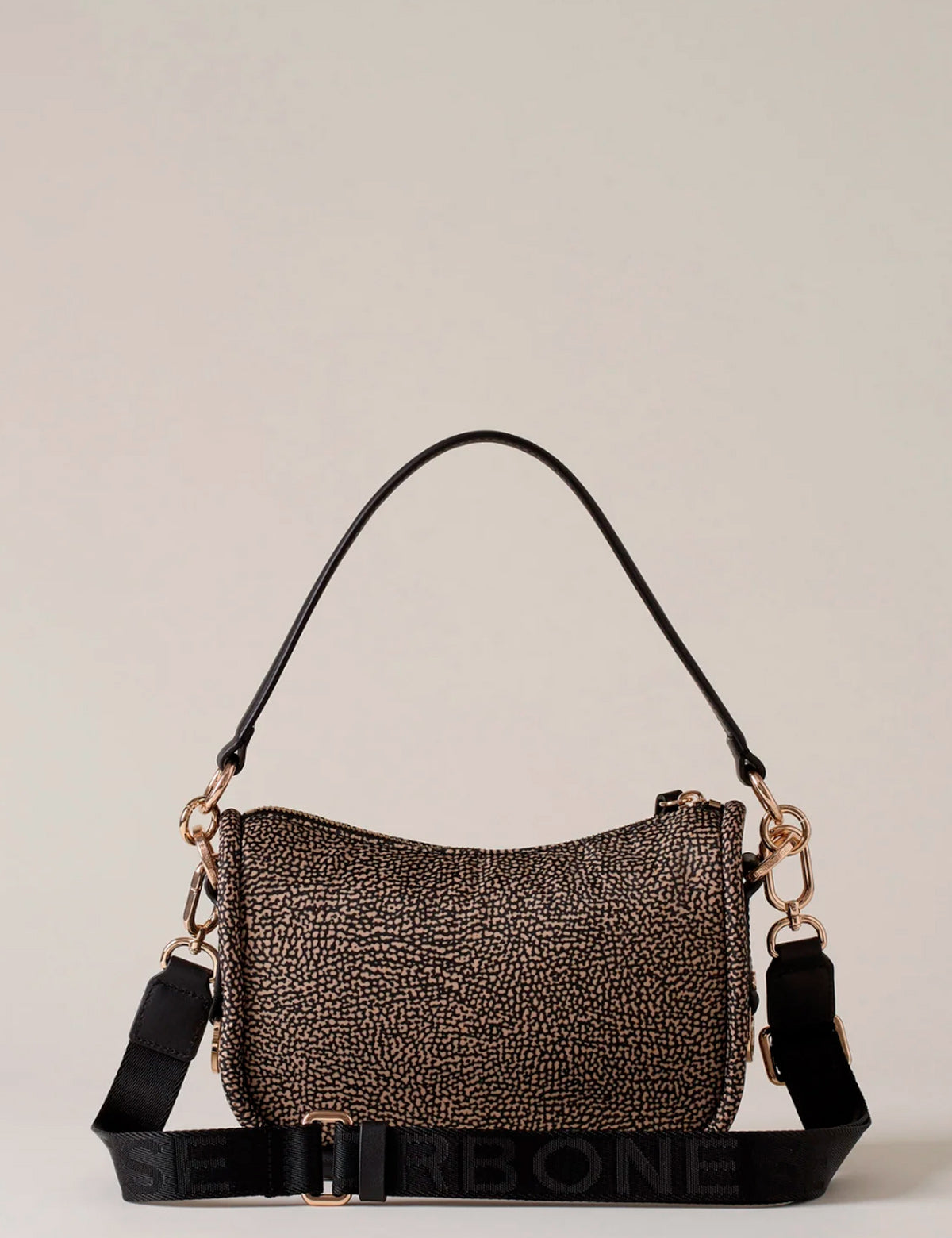 Borbonese women's shoulder bag with rounded shape, equipped with handle and shoulder strap, made of recycled OP print fabric with leather details