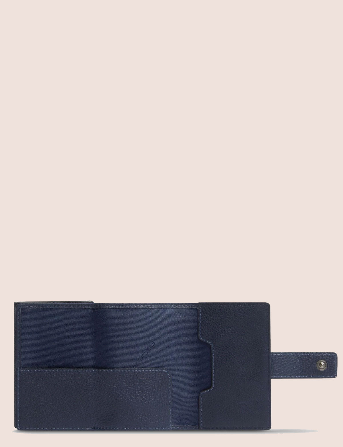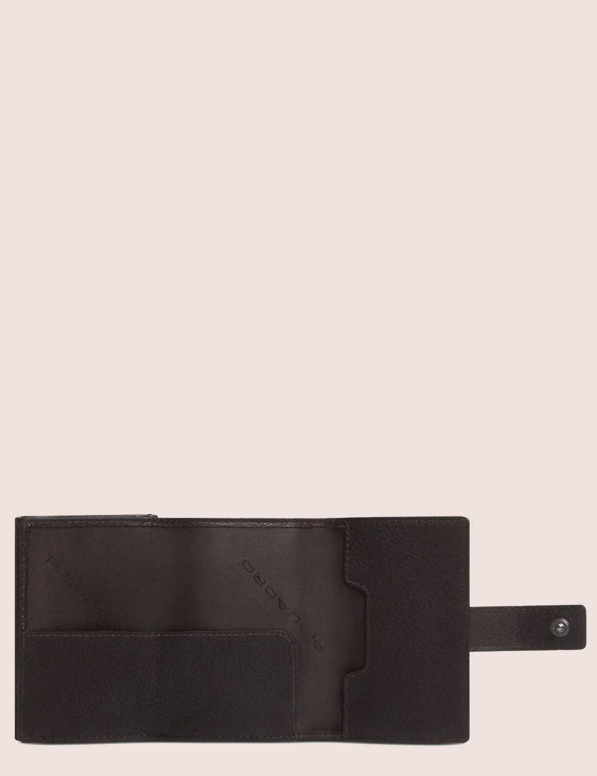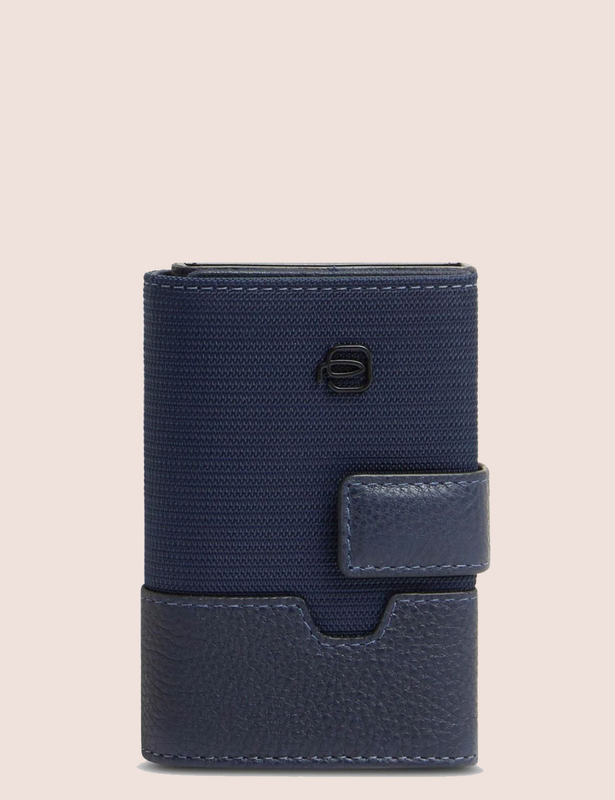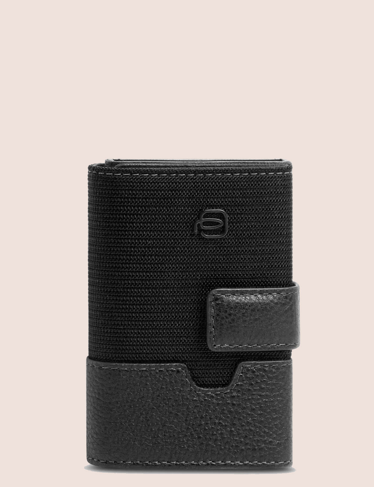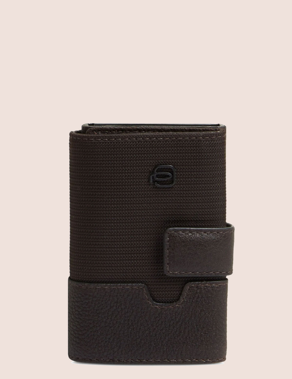 Piquadro wallet with a hard shell card holder and multi-fold document compartment. Made of leather and fabric.
