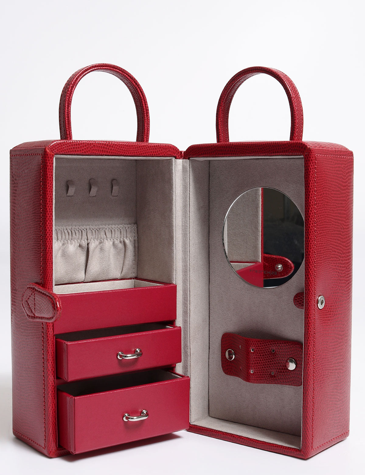 Friedrich23 vertical design wallet, with central opening and two upper handles. Model with internal mirrors and multifunctional drawers