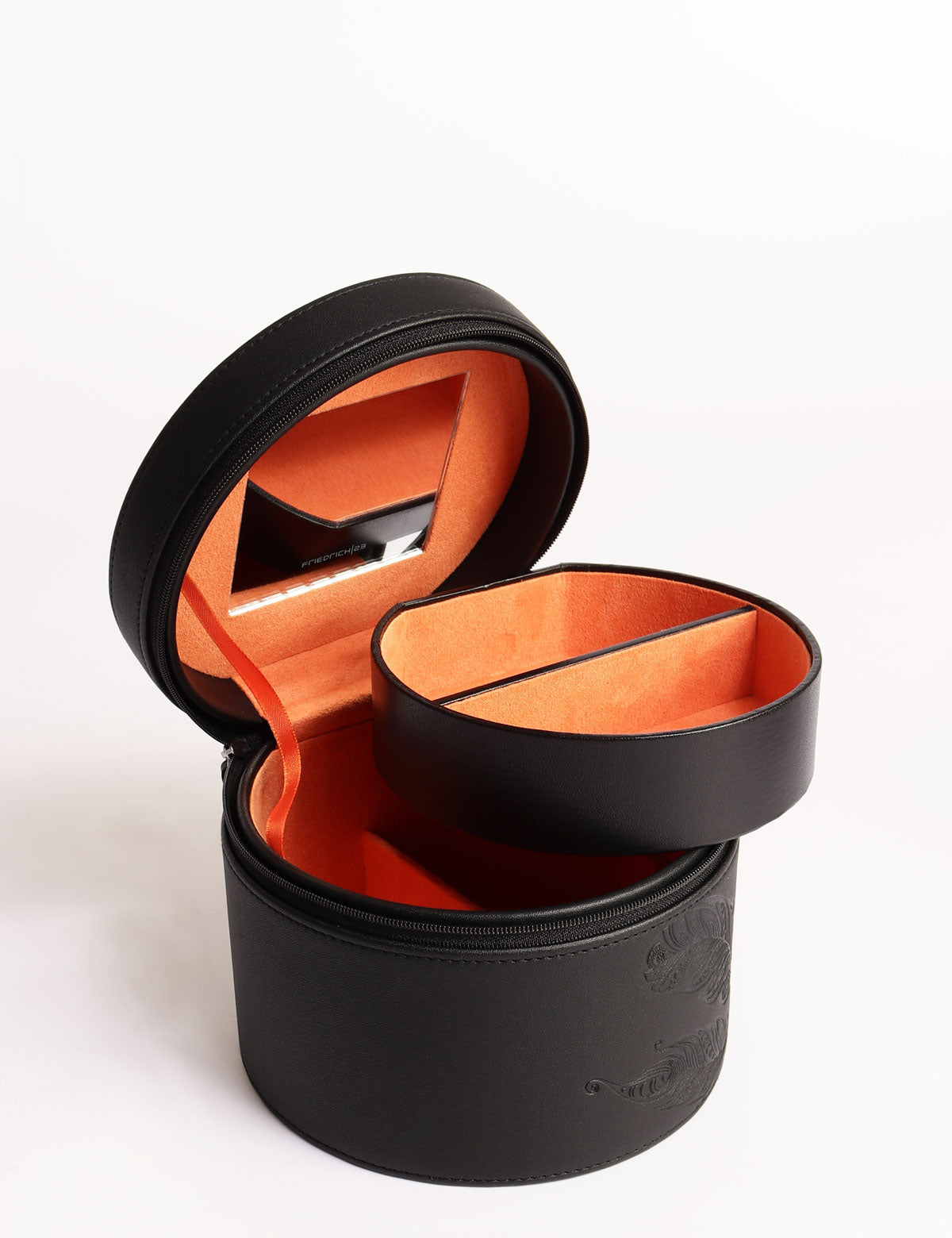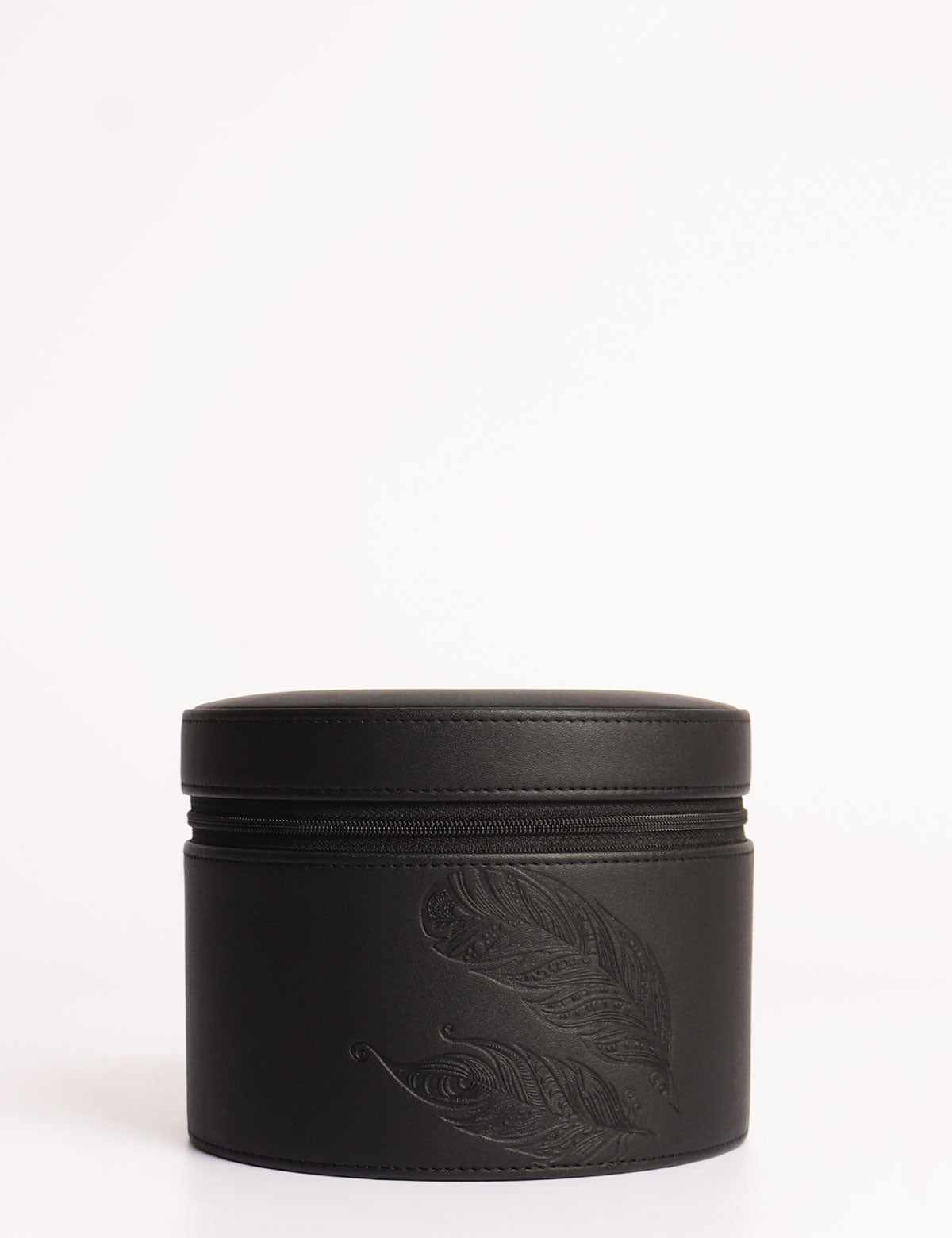 Friedrich23 round shaped jewelry box with elegant embossed feather detail and zip closure