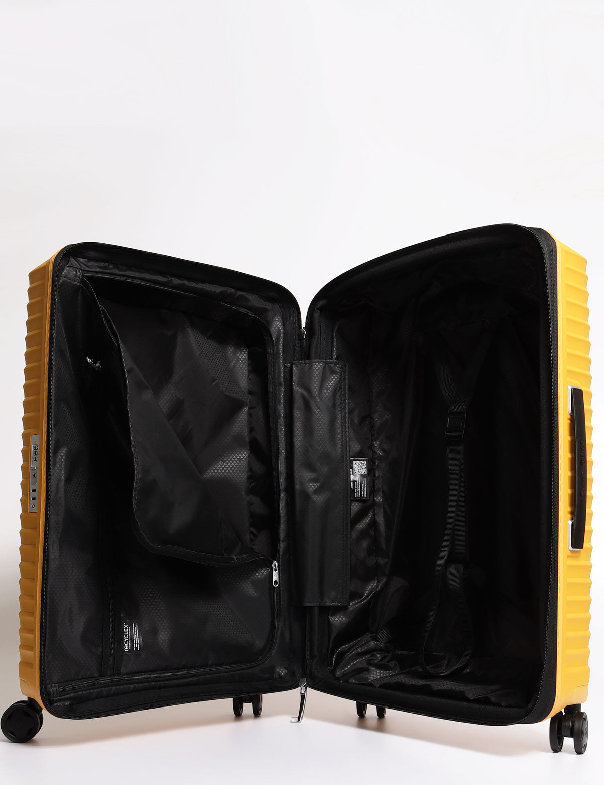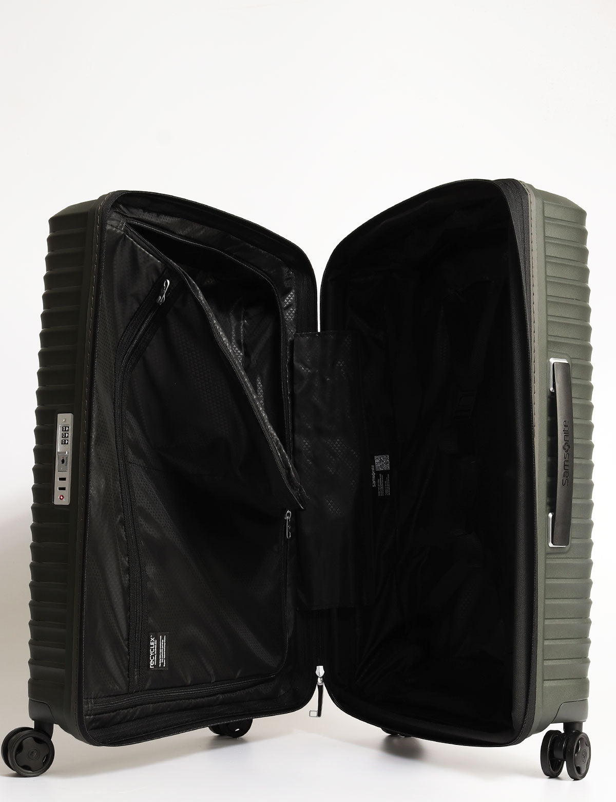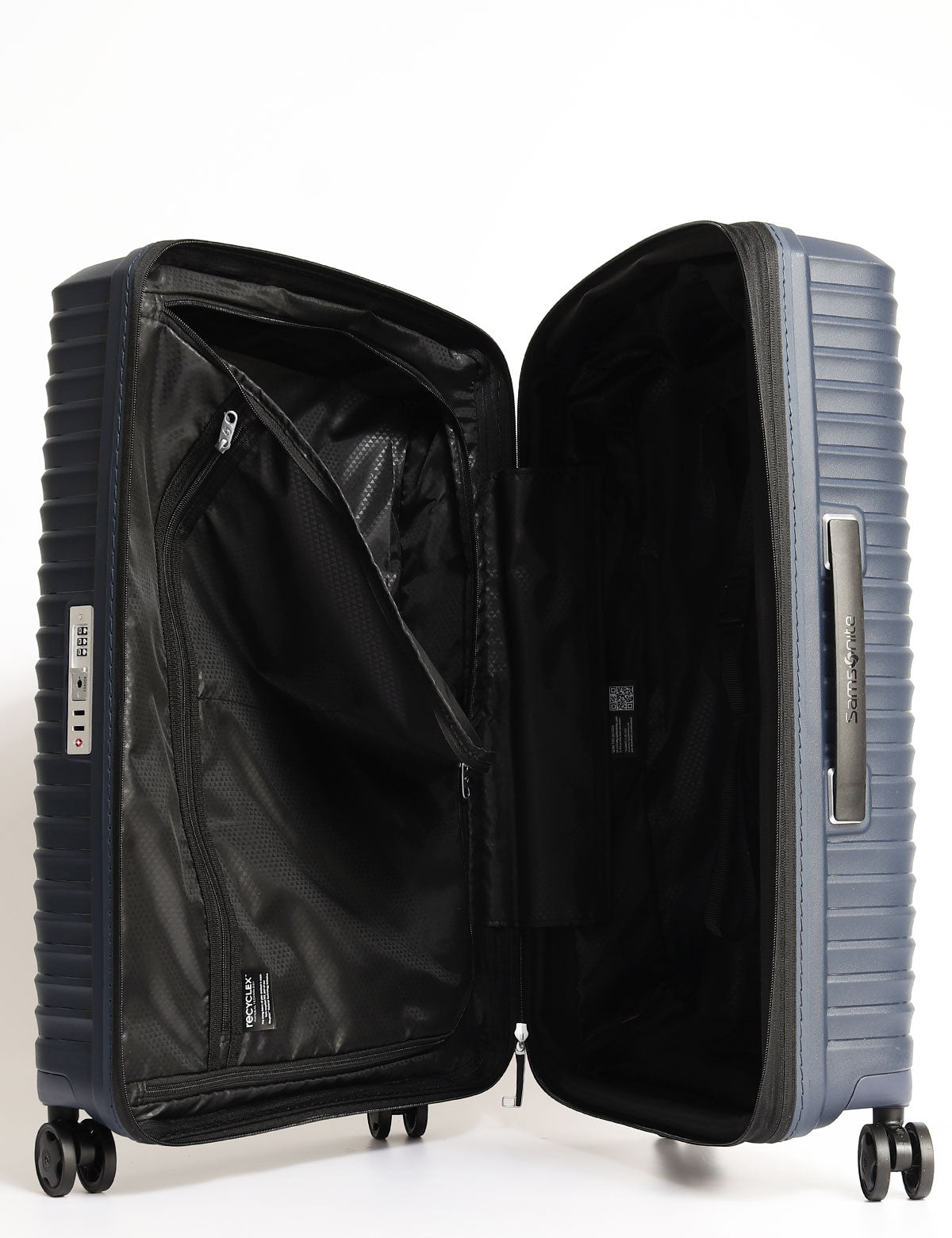 Samsonite hold luggage made from recycled material, featuring wheels with suspension to reduce shock and a removable and washable lining