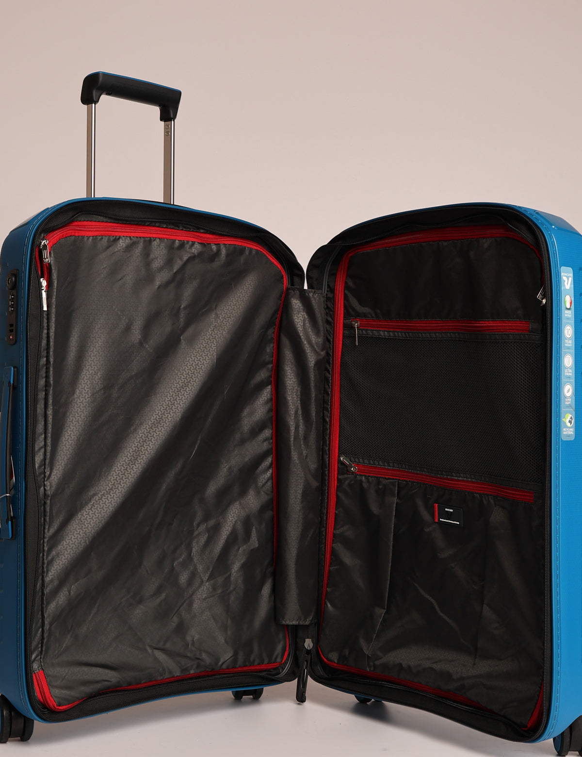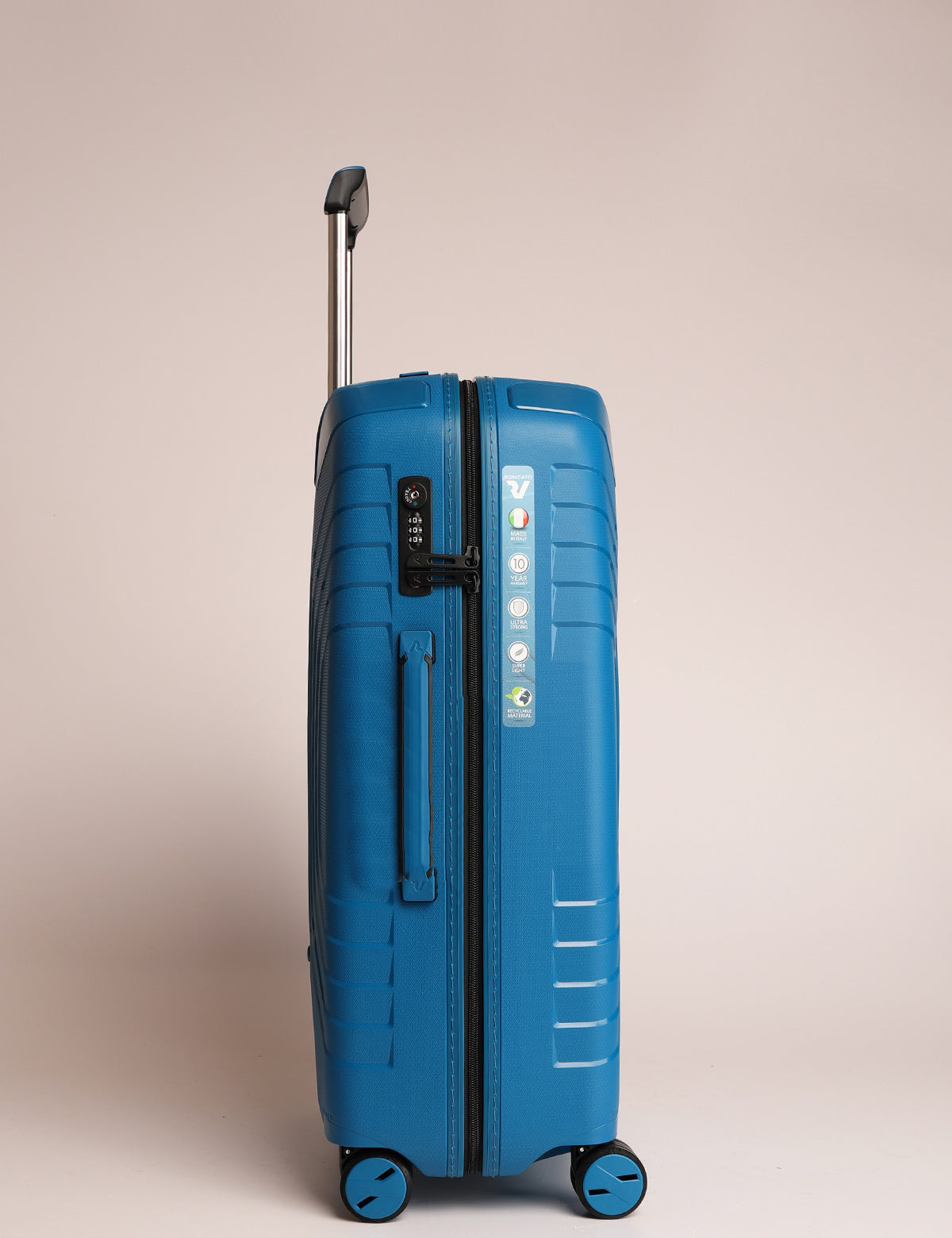 The Ypsilon 4.0 line by Roncato is a collection of expandable hard suitcases, made of 100% recyclable polypropylene, designed and produced entirely in Italy. It offers three sizes (cabin, medium and large), all equipped with four swivel wheels, TSA lock and protective corners. The cabin model includes an integrated USB port for charging electronic devices during travel. The collection combines lightness, resistance and environmental sustainability.