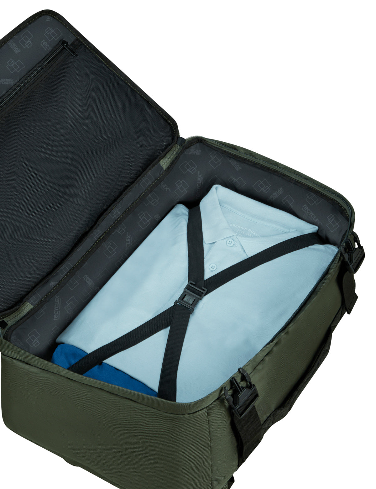 Designed with Recyclex™ recycled materials and a practical and sporty design, this travel backpack is ideal as a carry-on thanks to its compact size and great organization capacity. The numerous pockets, the wide clamshell opening and the internal compression straps make every journey easier and more organized.