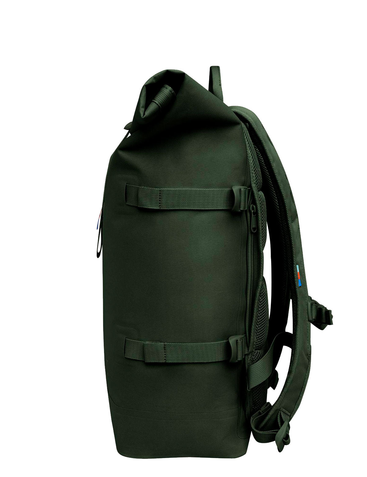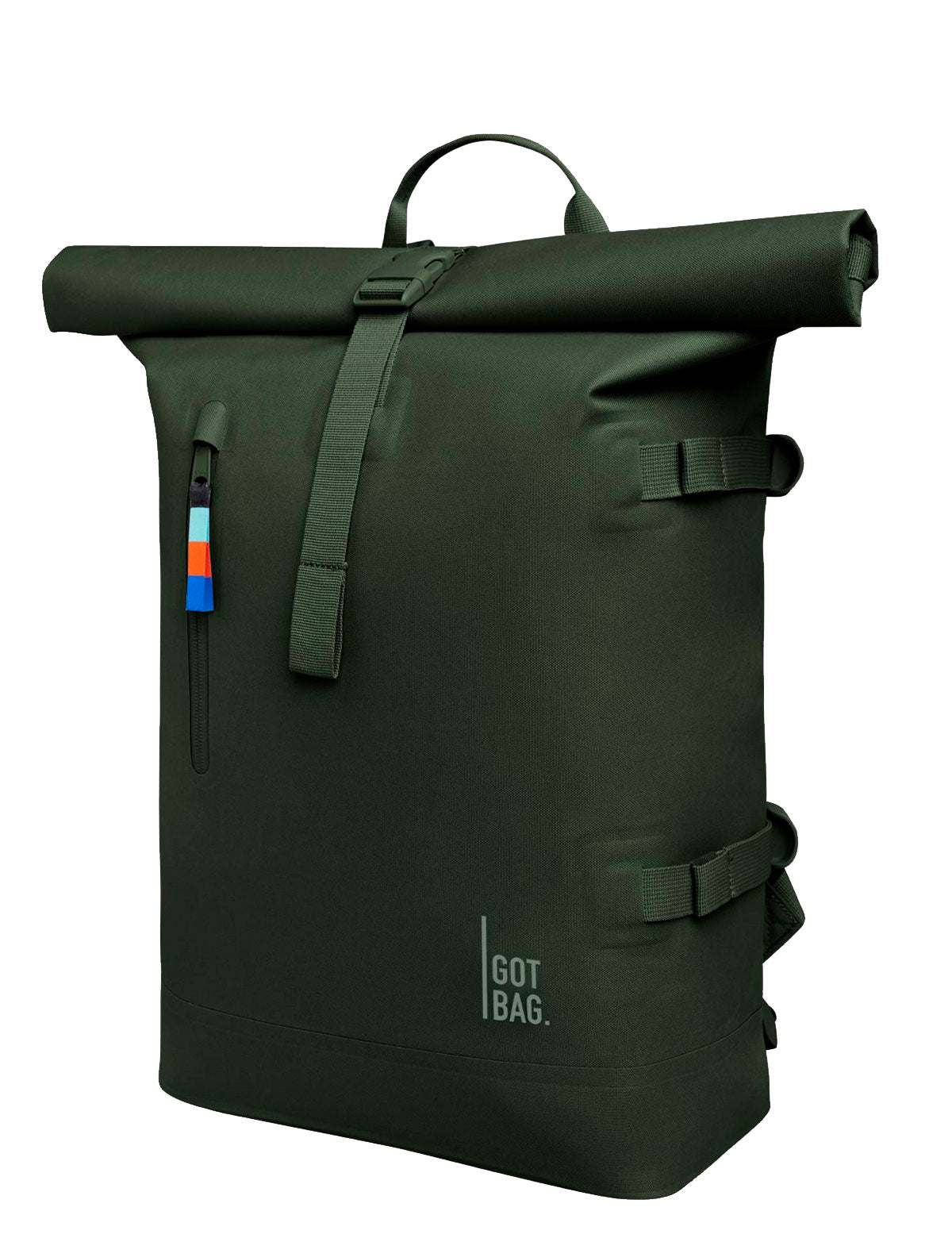 Got Bag Rolltop laptop backpack with roll-up top to close with a buckle, large model with additional side buckles to adjust the depth and small vertical front pocket. Model made with recycled material from the ocean, waterproof and free of PVC and PFC