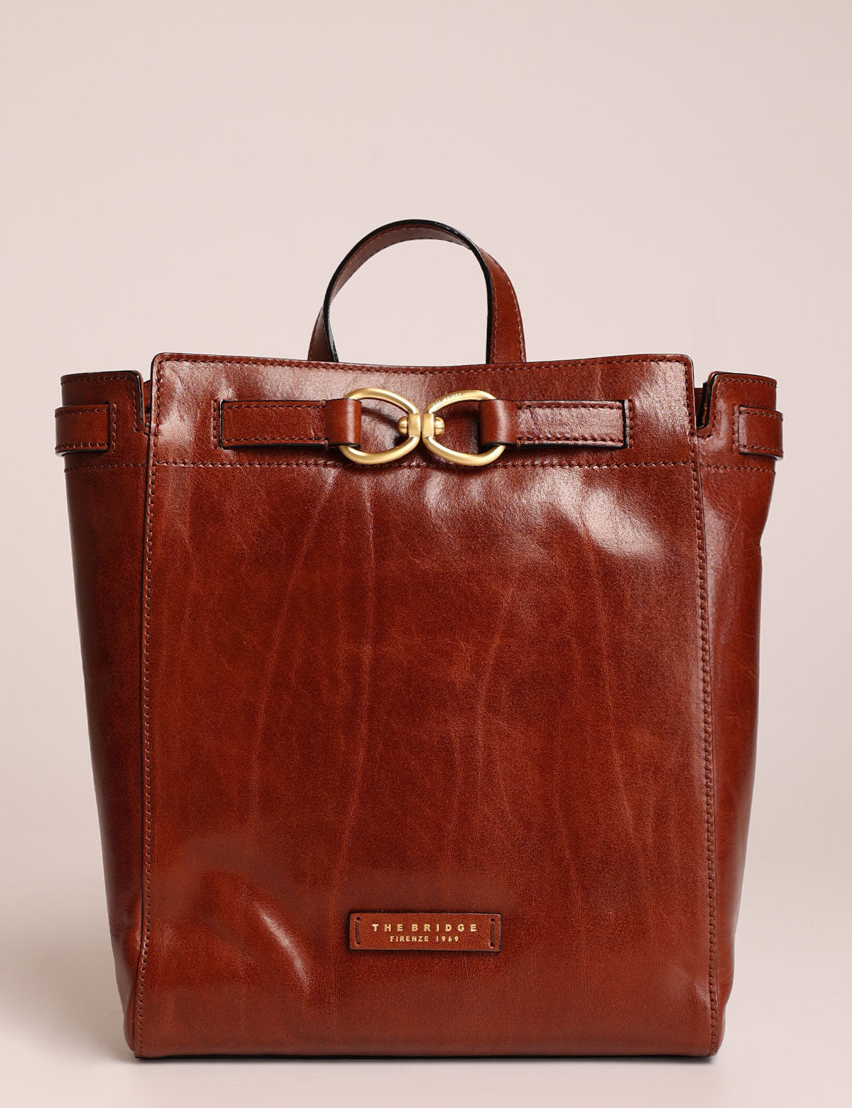 The Bridge women's backpack made of shiny leather, featuring a geometric design and a front metal detail.