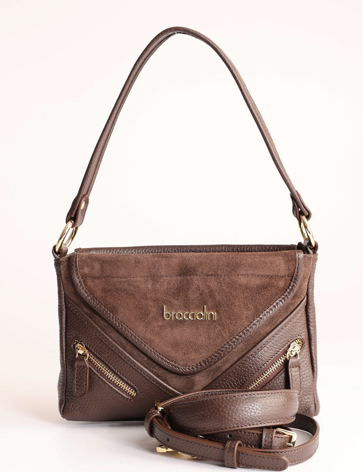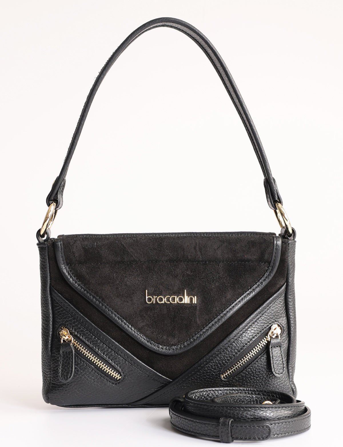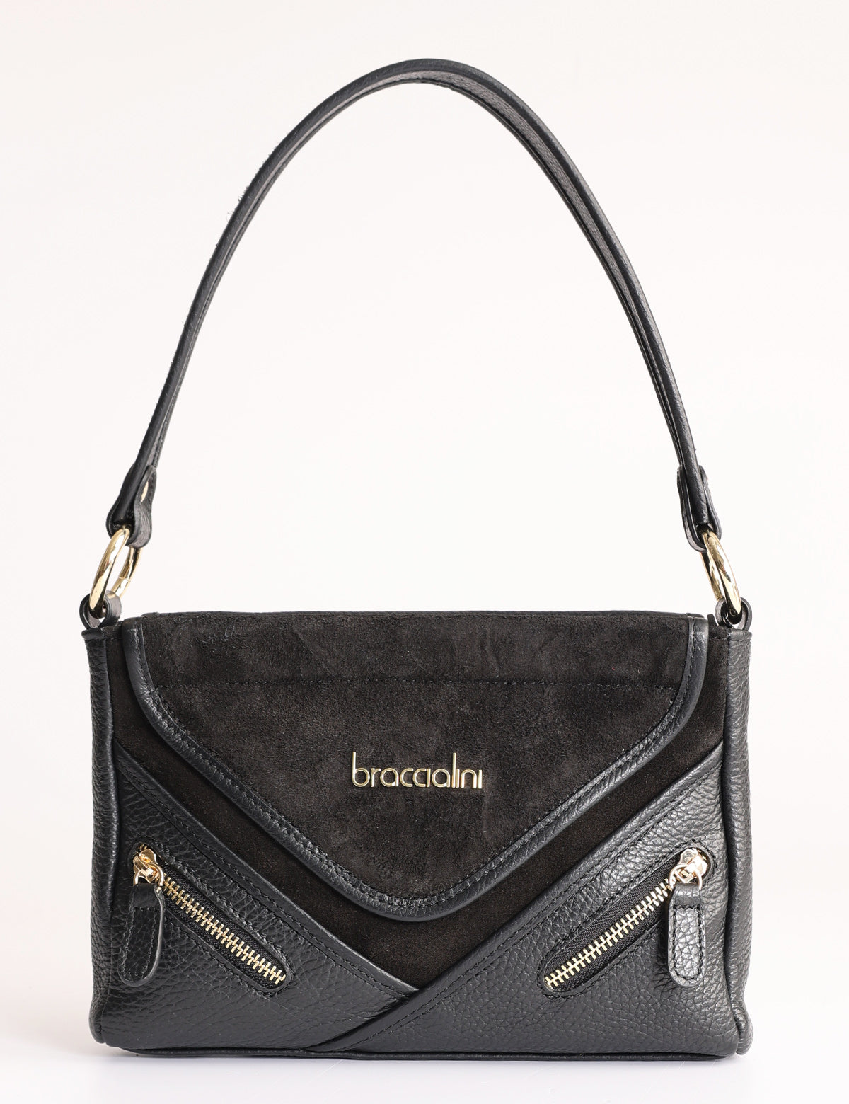 Borsetta a spalla Braccialini in pelle e pelle scamosciata con ulteriore tracolla. Modello dal design strutturato con dettagli color oro