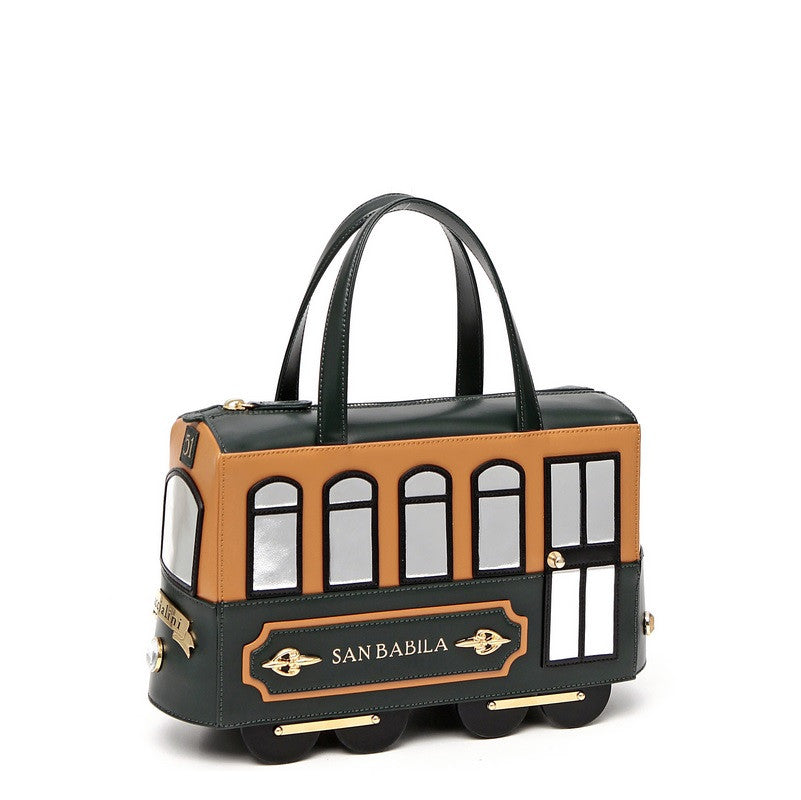 Borsa Braccialini Tema tram San Babila, dimensioni 27x20x10, realizzata in pelle di vitello e decorata a mano con dettagli metallici, dotata di doppio manico e chiusura zip, codice prodotto B10101