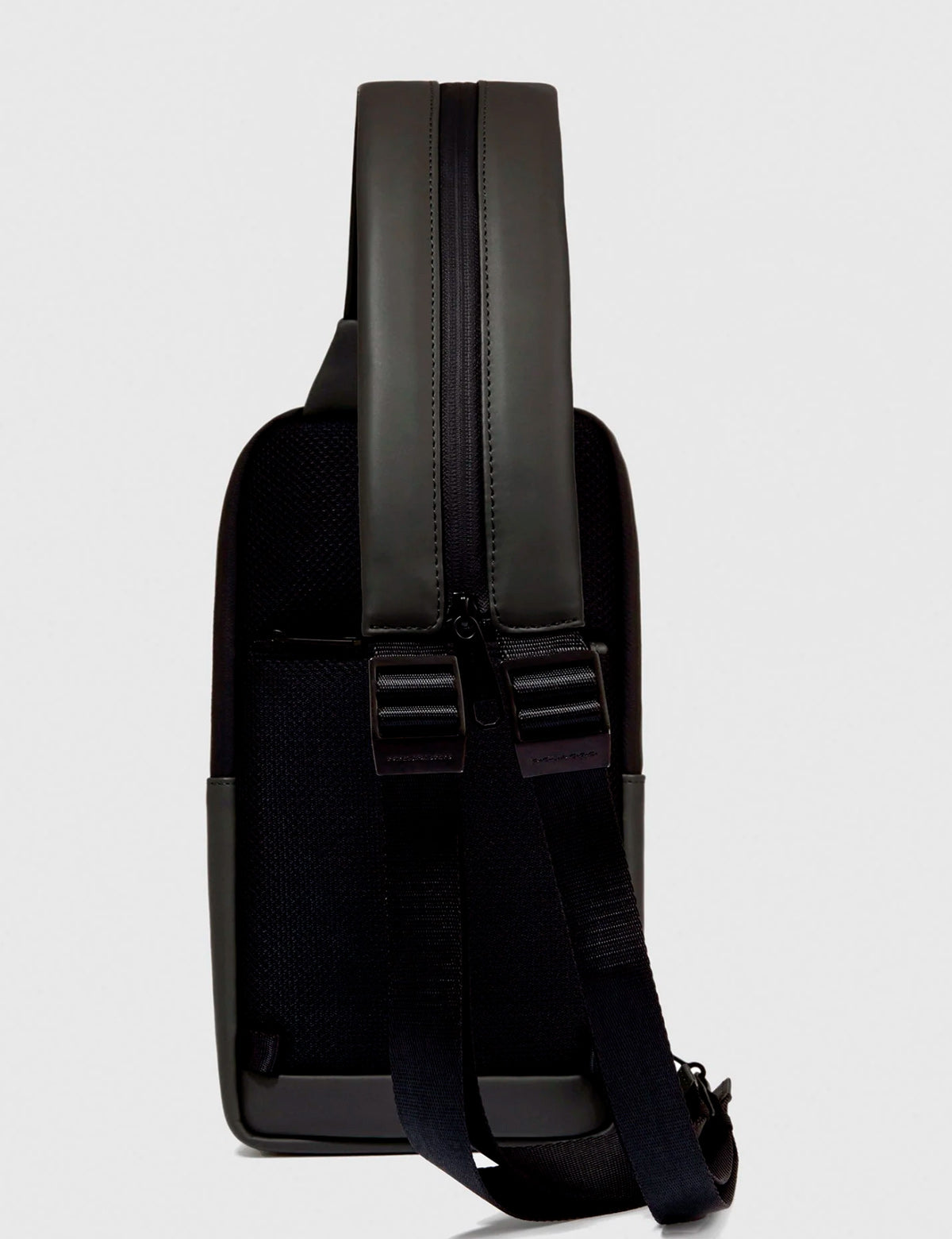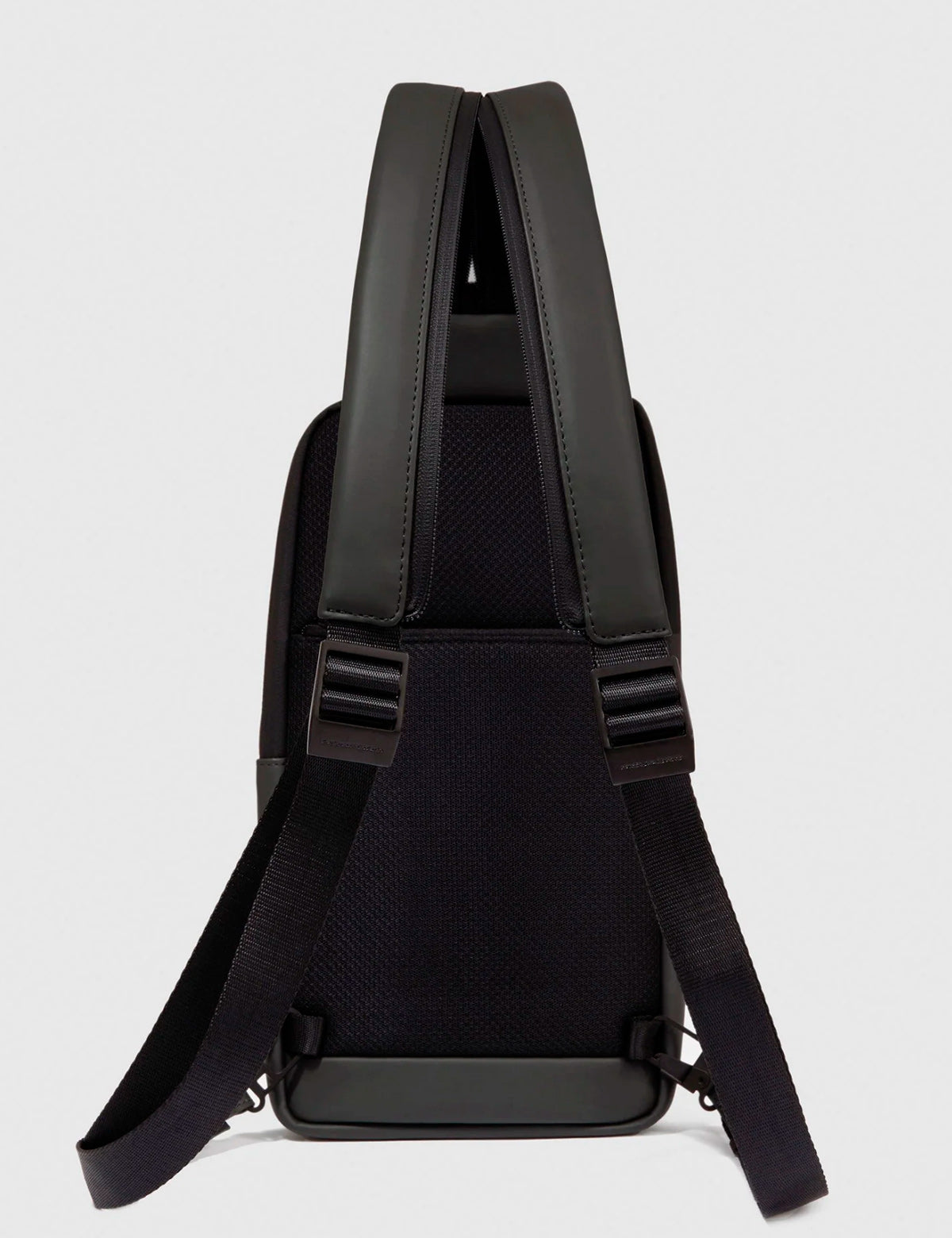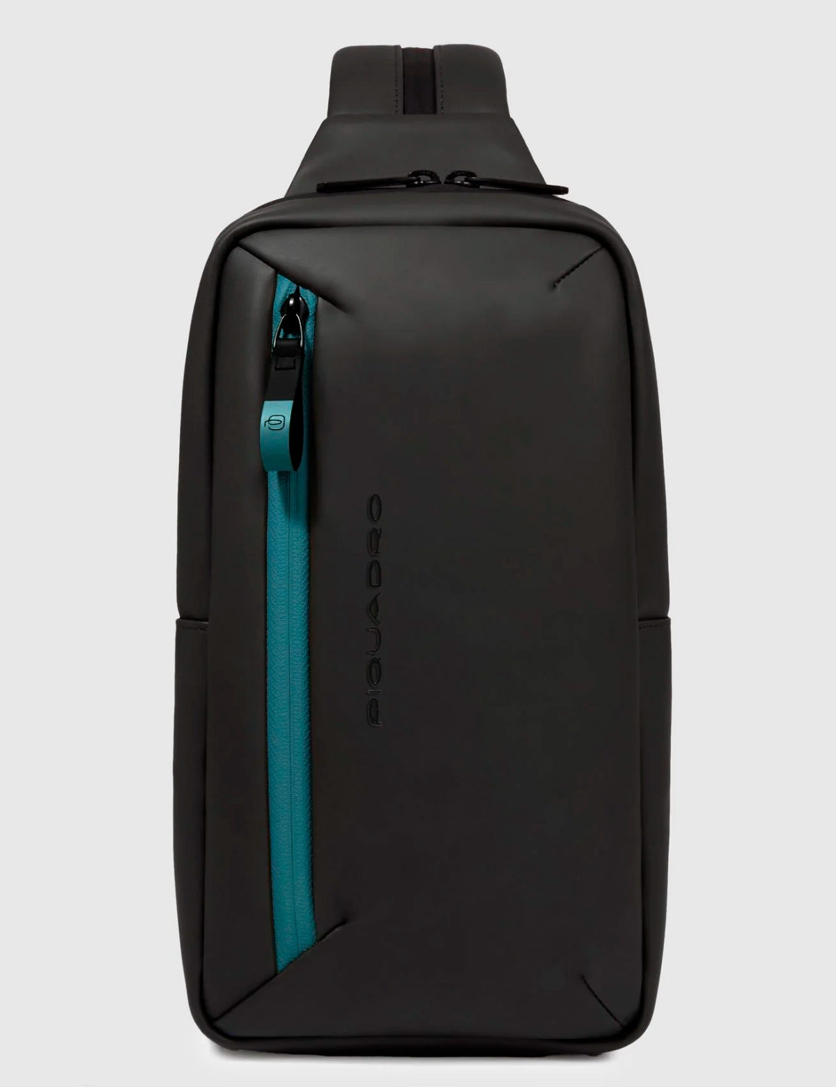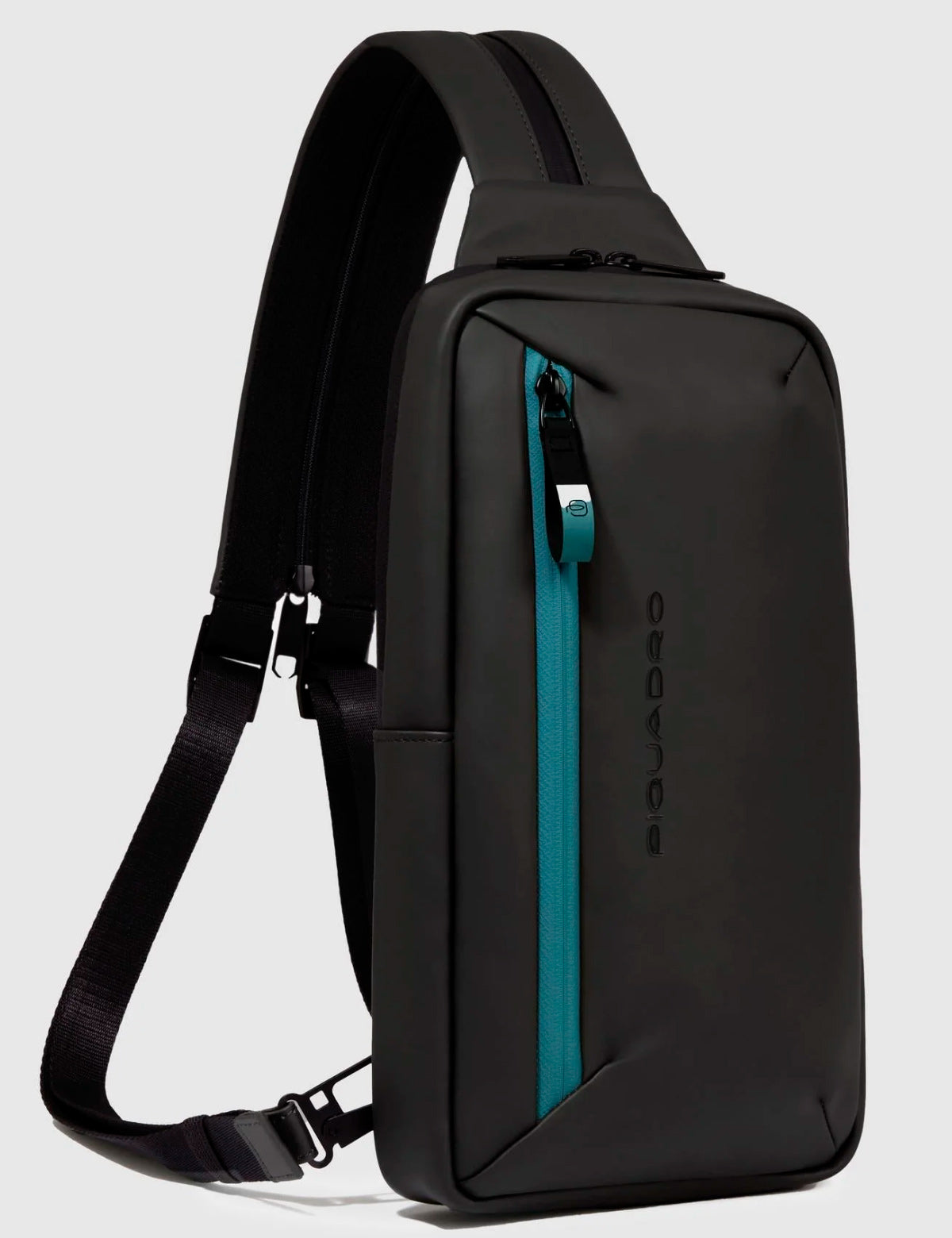Tracolla Piquadro modello monospalla con spallaccio divisibile grazie alla cerniera per essere trasportato come un classico zaino.