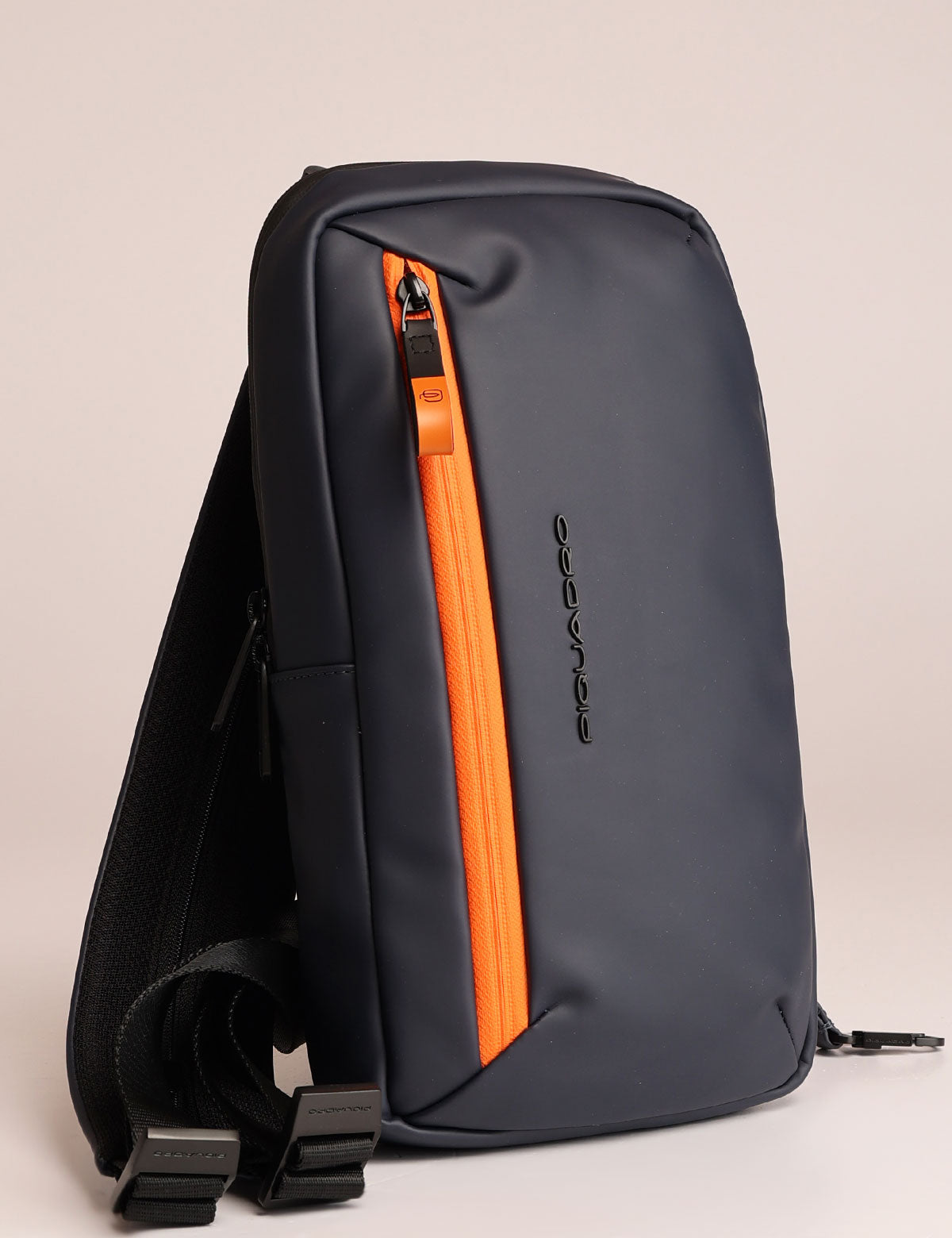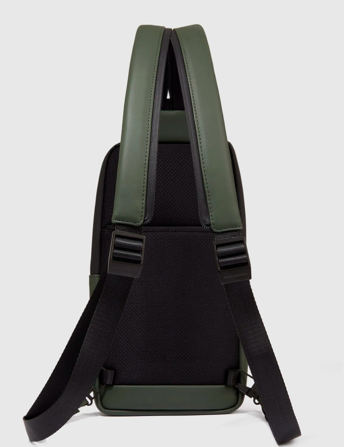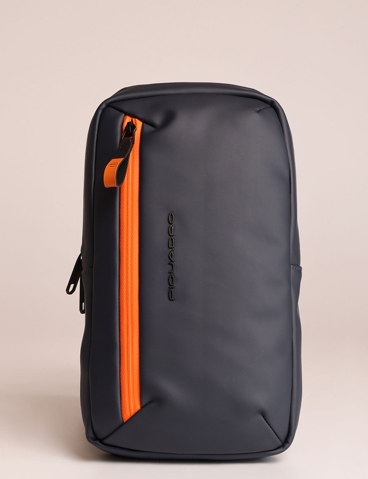 Tracolla Piquadro modello monospalla con spallaccio divisibile grazie alla cerniera per essere trasportato come un classico zaino.