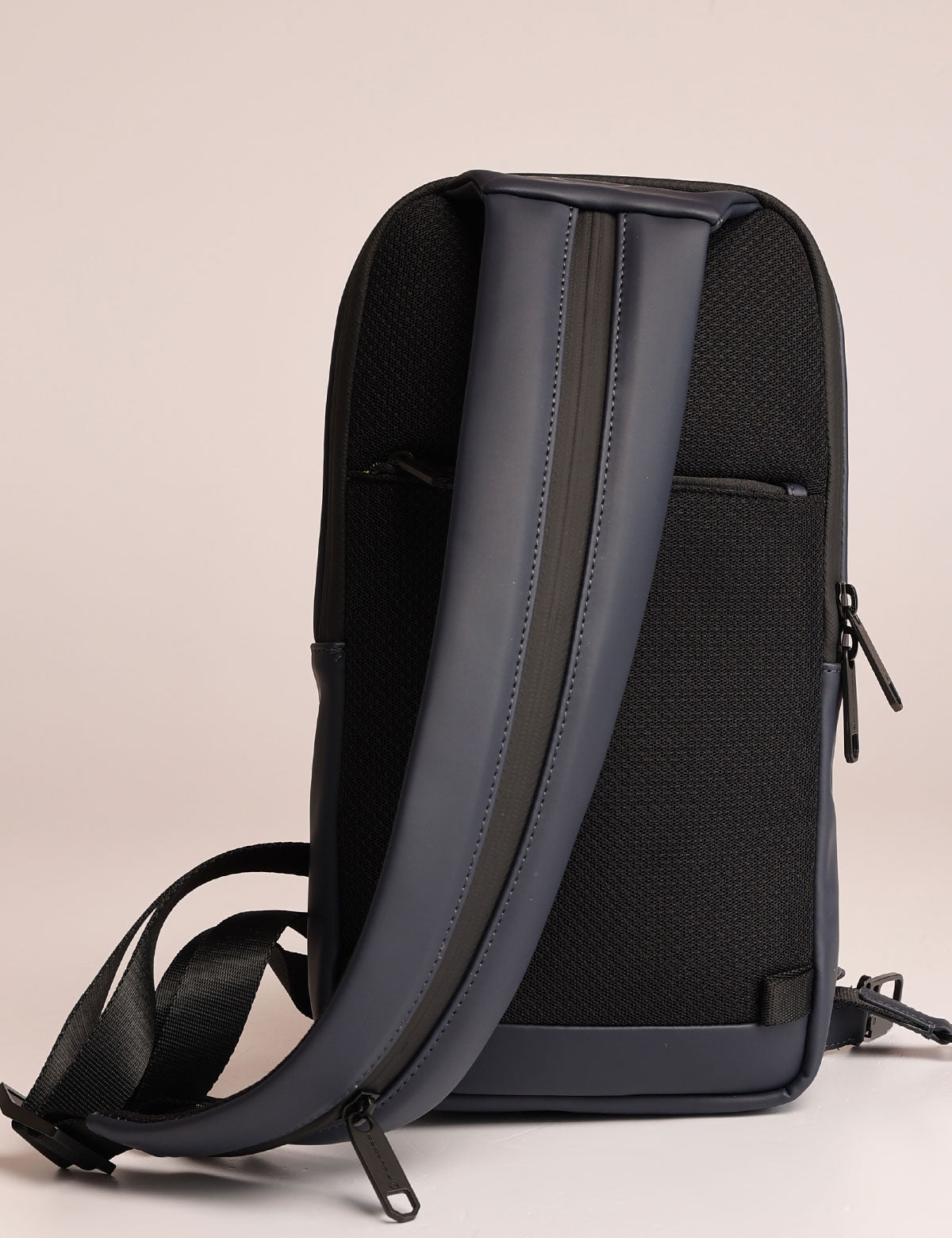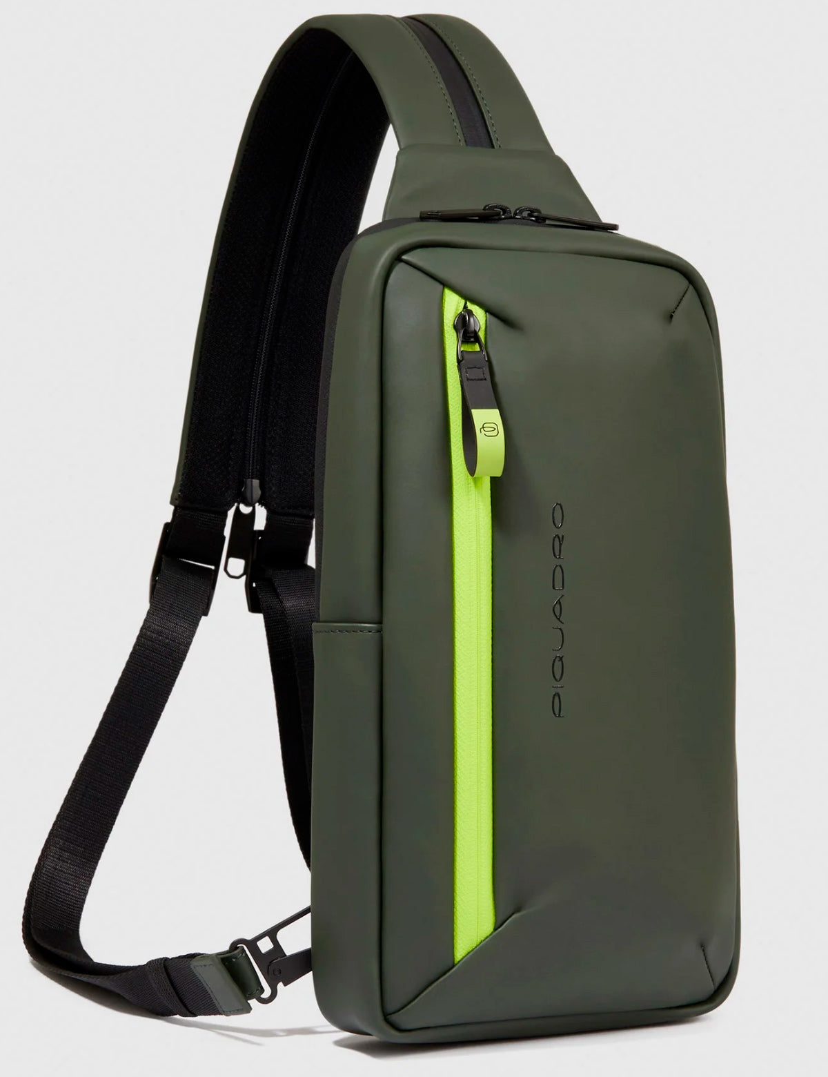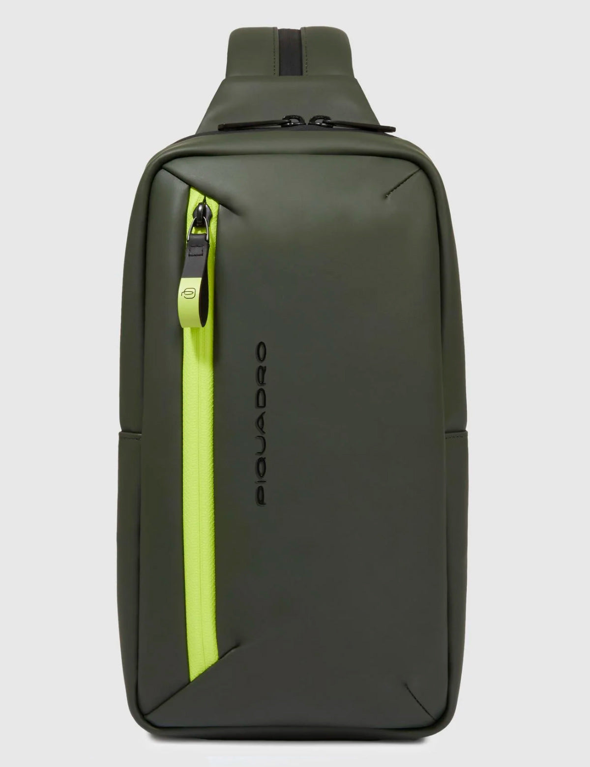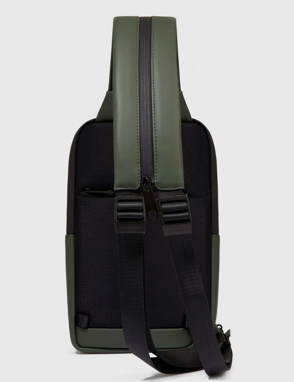Tracolla Piquadro modello monospalla con spallaccio divisibile grazie alla cerniera per essere trasportato come un classico zaino.