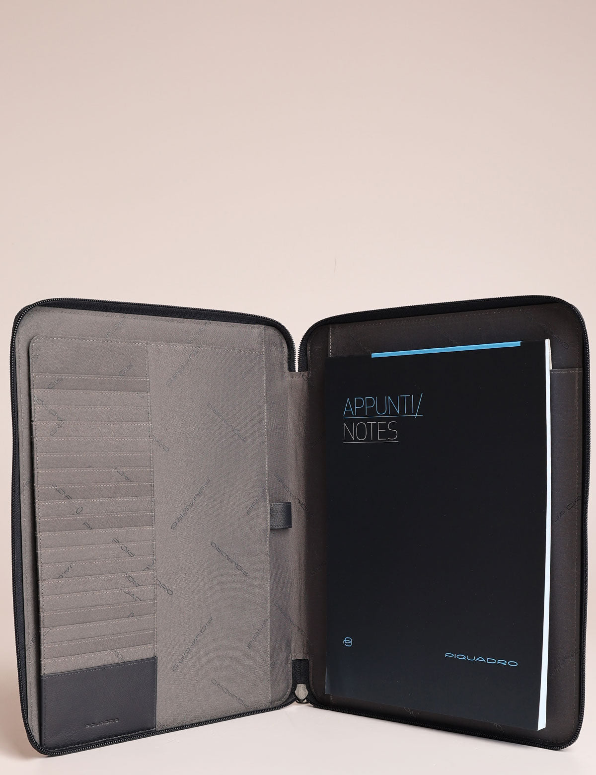 Portablocco da lavoro Piquadro in tessuto tecnico e dettagli in pelle, formato A4 con blocco interno e slot porta carte