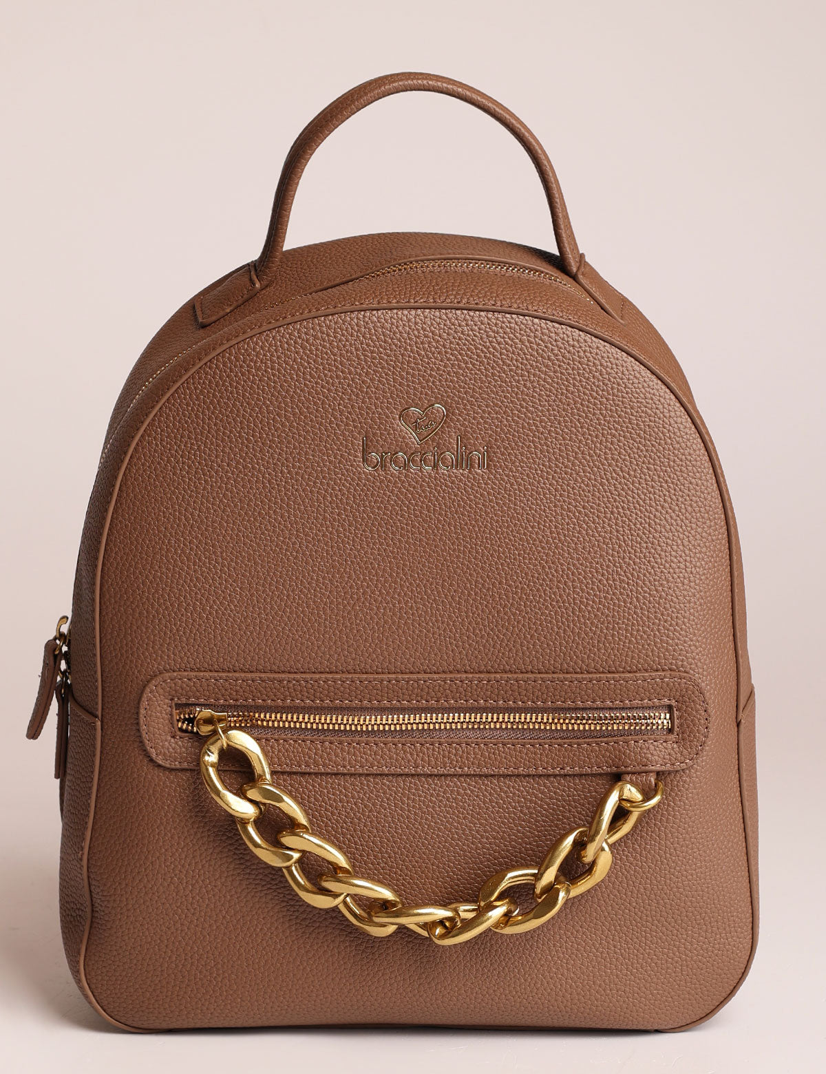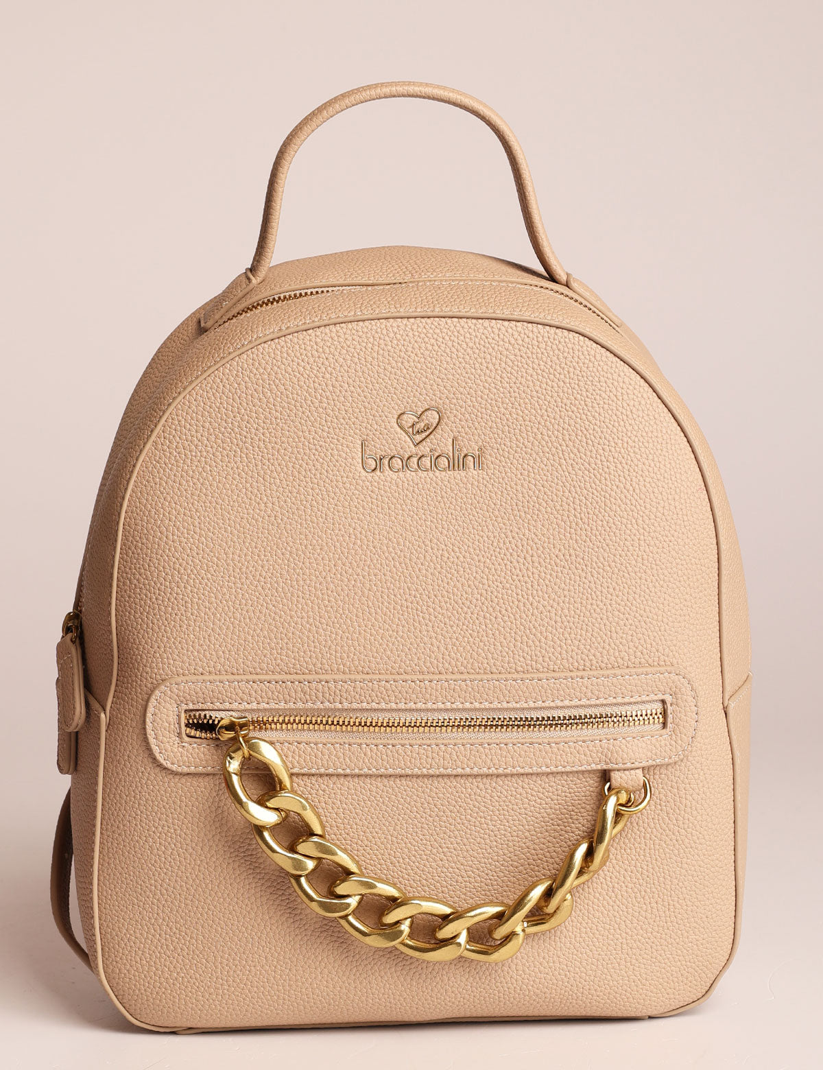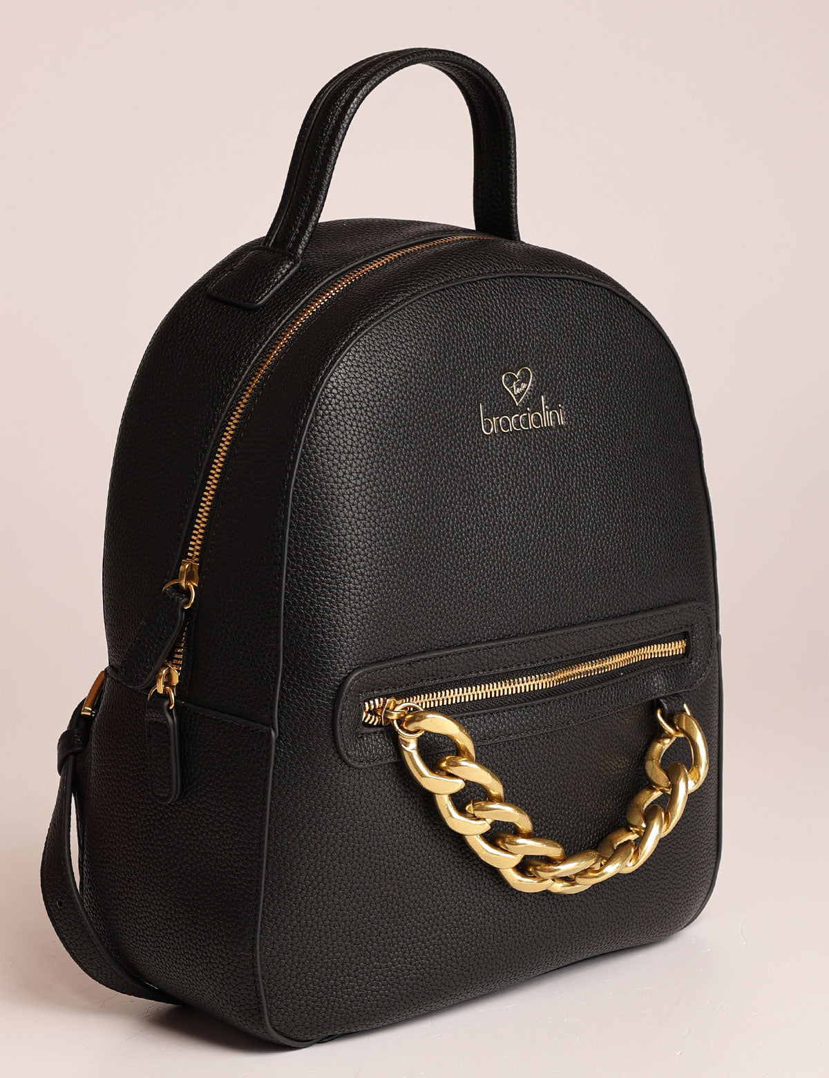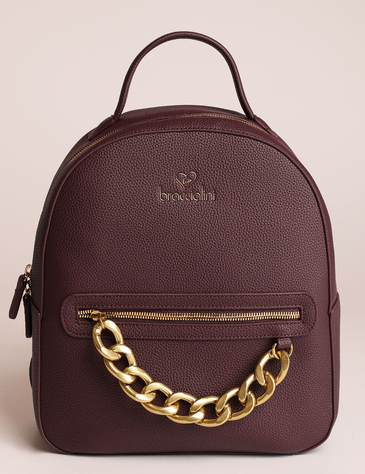 Zainetto da donna Braccialini con particolare dettaglio frontale della catena in metallo brunito all'altezza della tasca