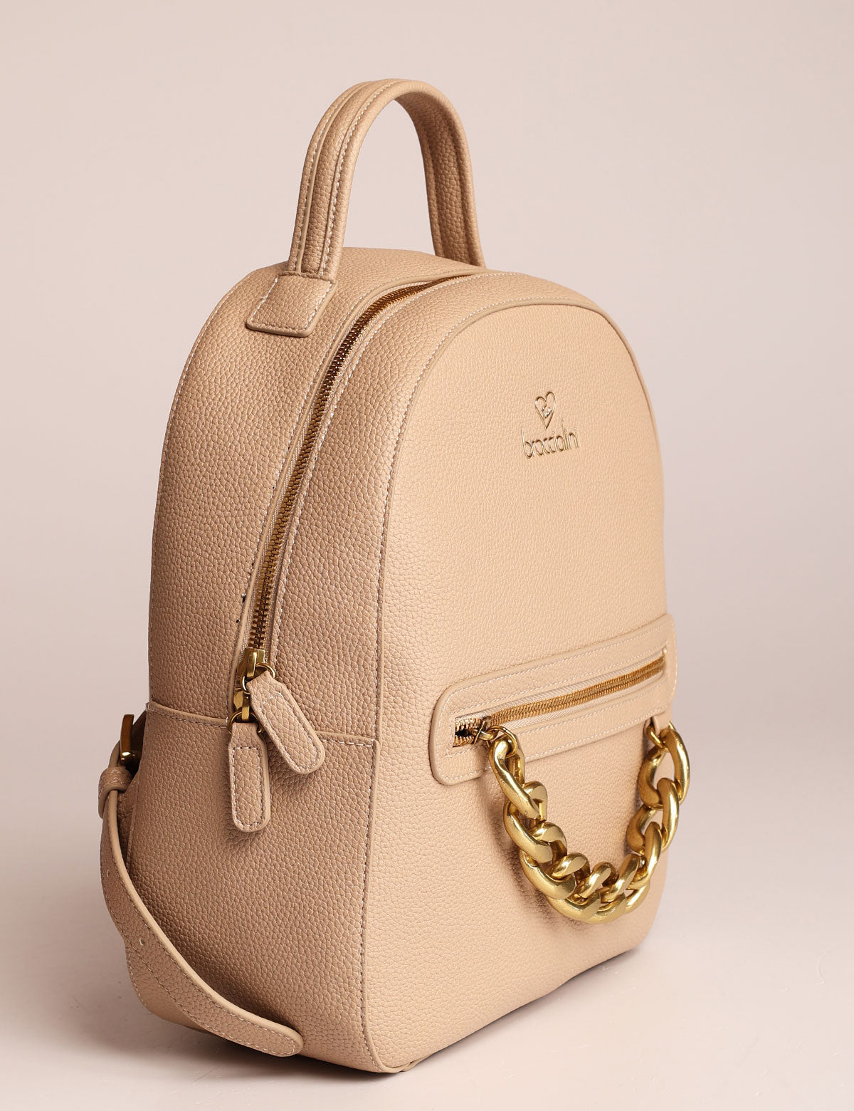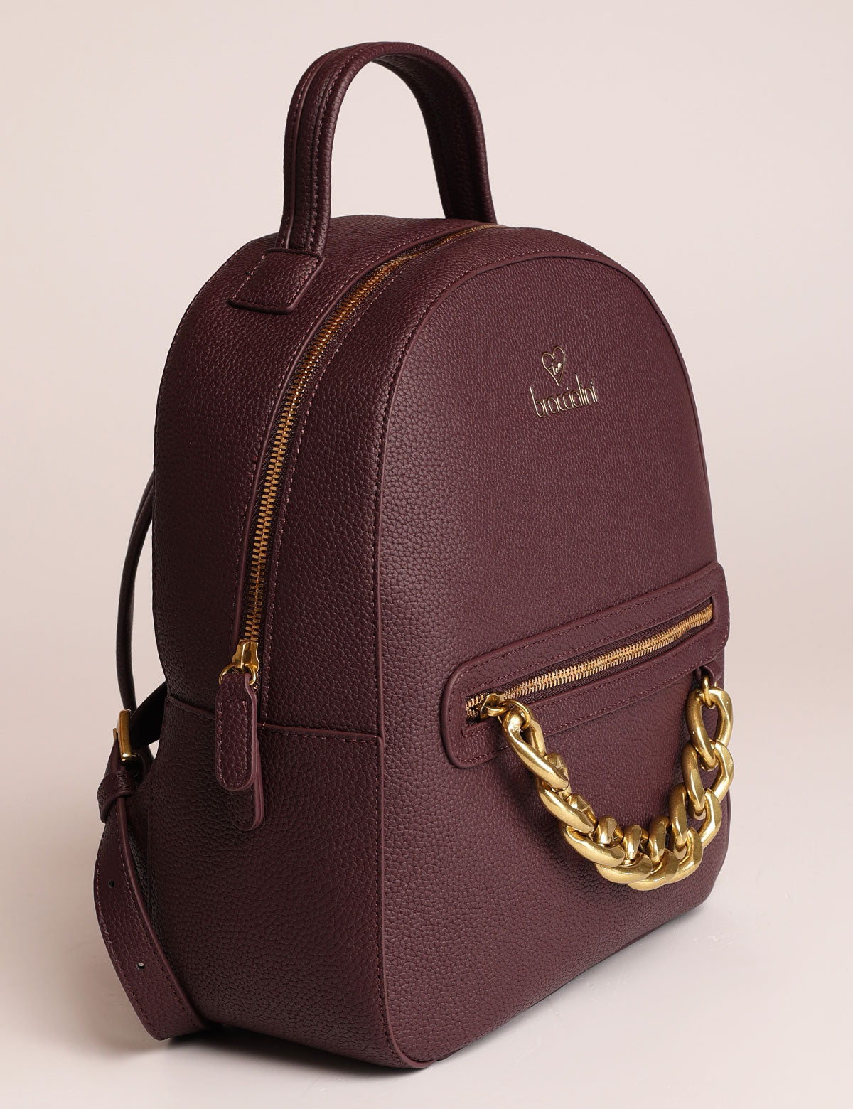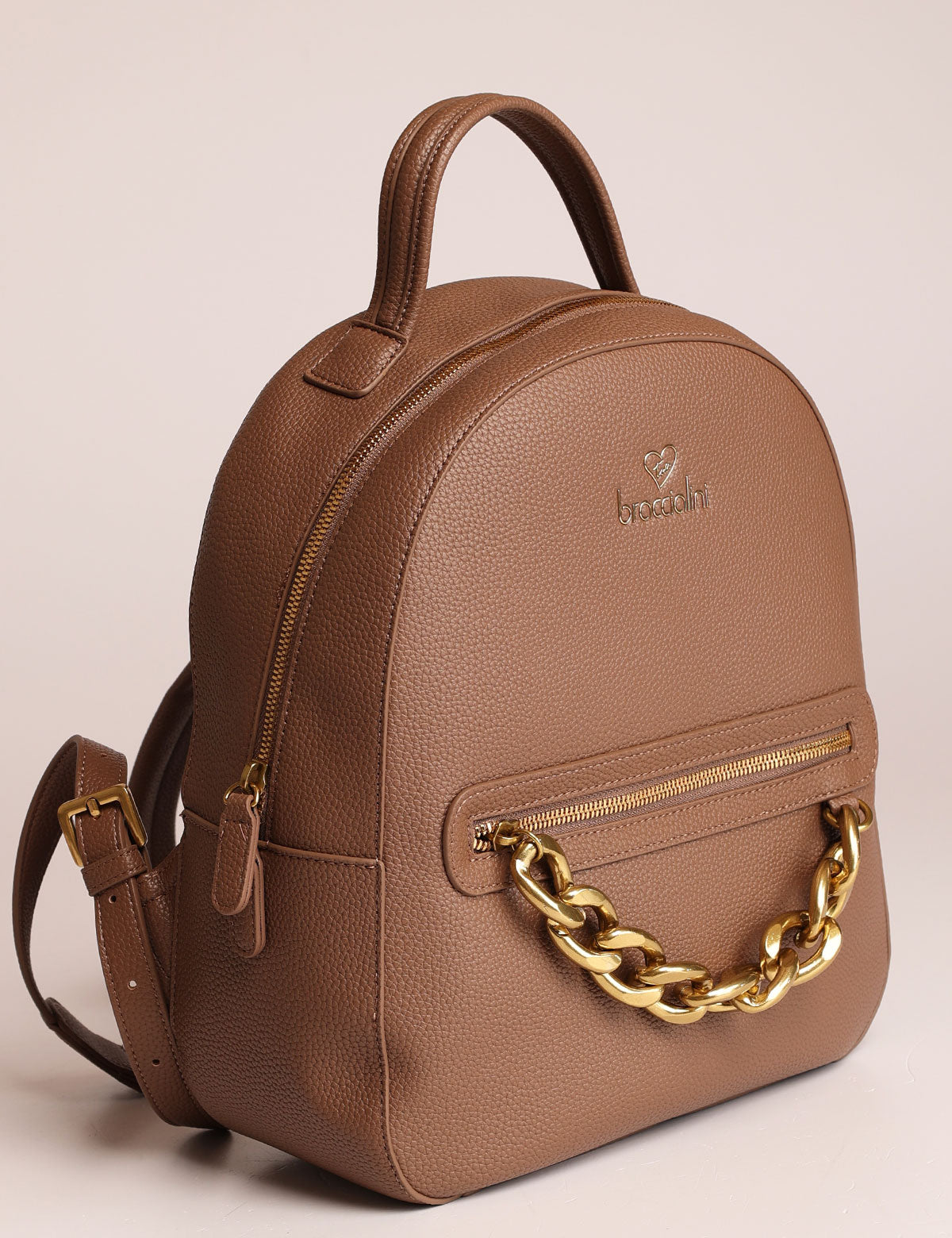 Zainetto da donna Braccialini con particolare dettaglio frontale della catena in metallo brunito all'altezza della tasca