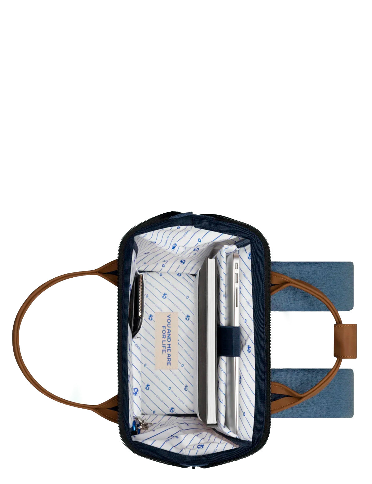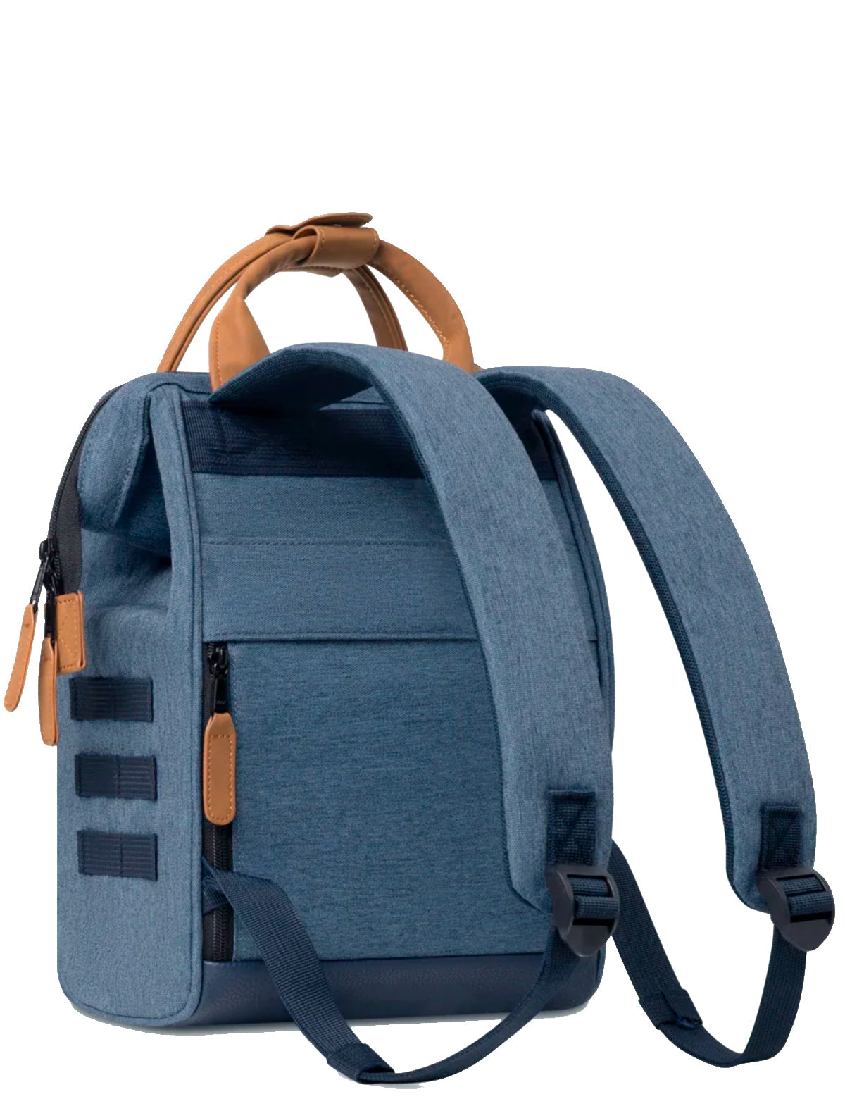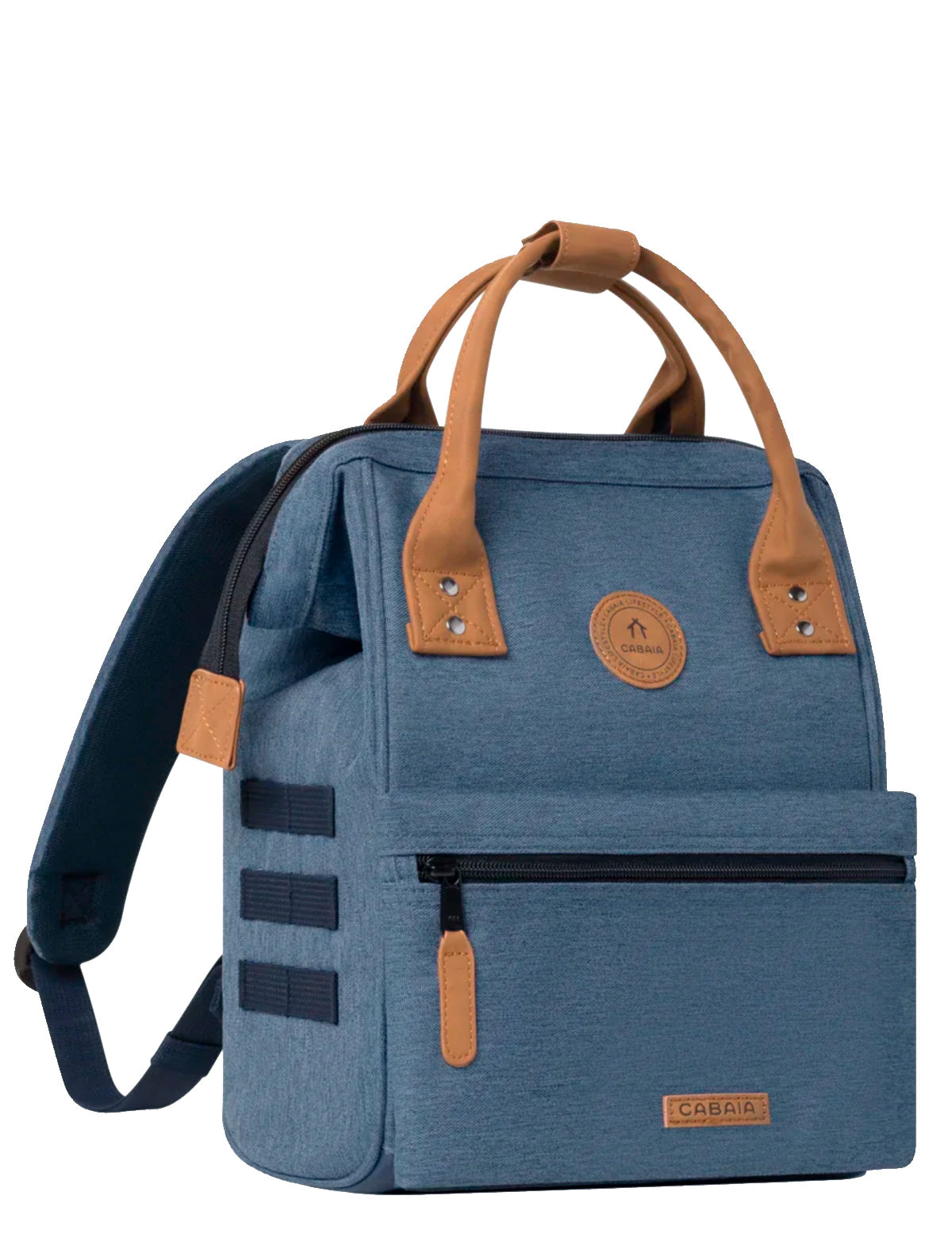 Zaino in tessuto denim Cabaia con particolare apertura superiore grandangolare e tasca frontale intercambiabile. Prodotto con materiali riciclati.