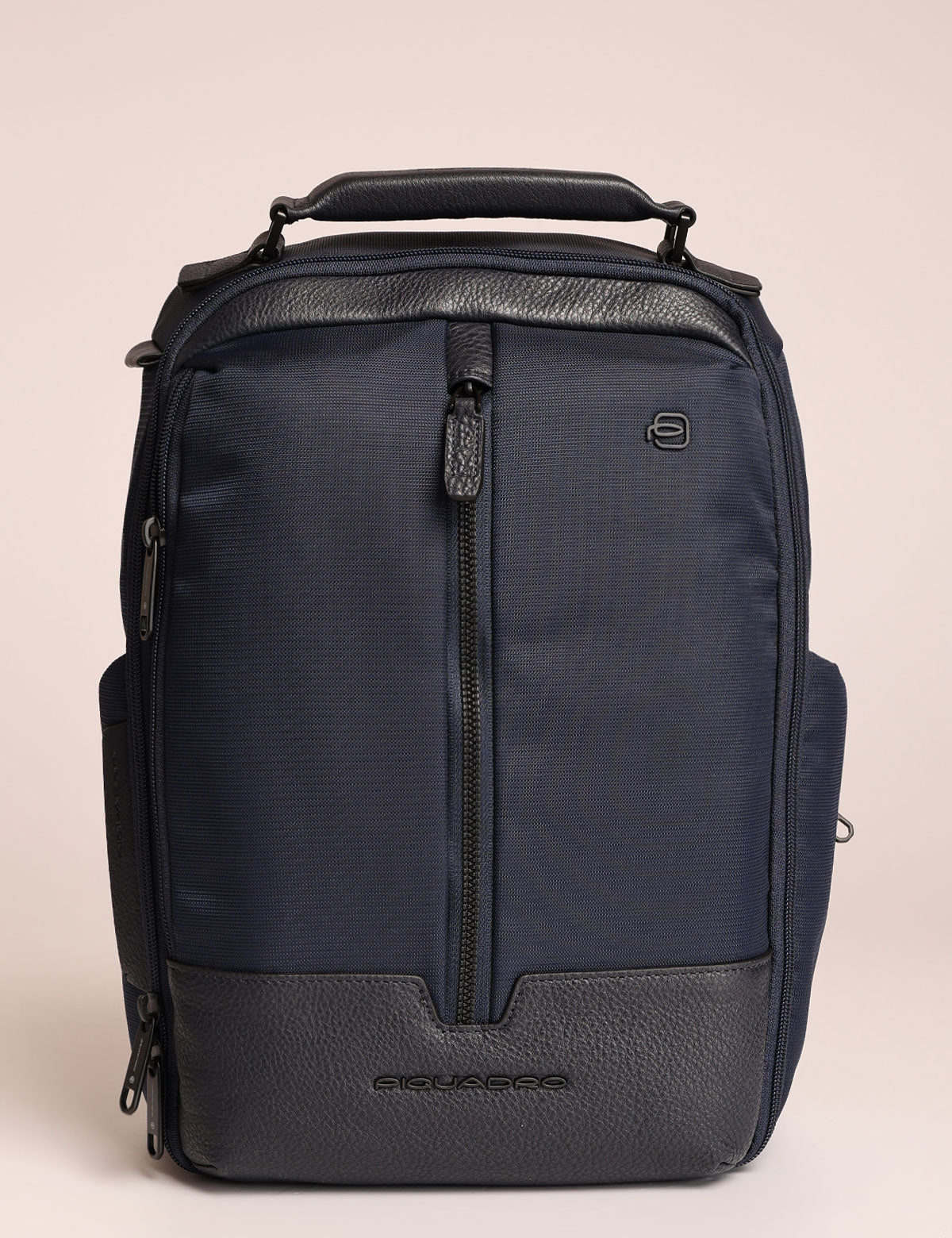 Zaino porta computer Piquadro in tessuto tecnico riciclato e dettagli in pelle, con particolare tasca frontale e scomparto per laptop shock absorbing