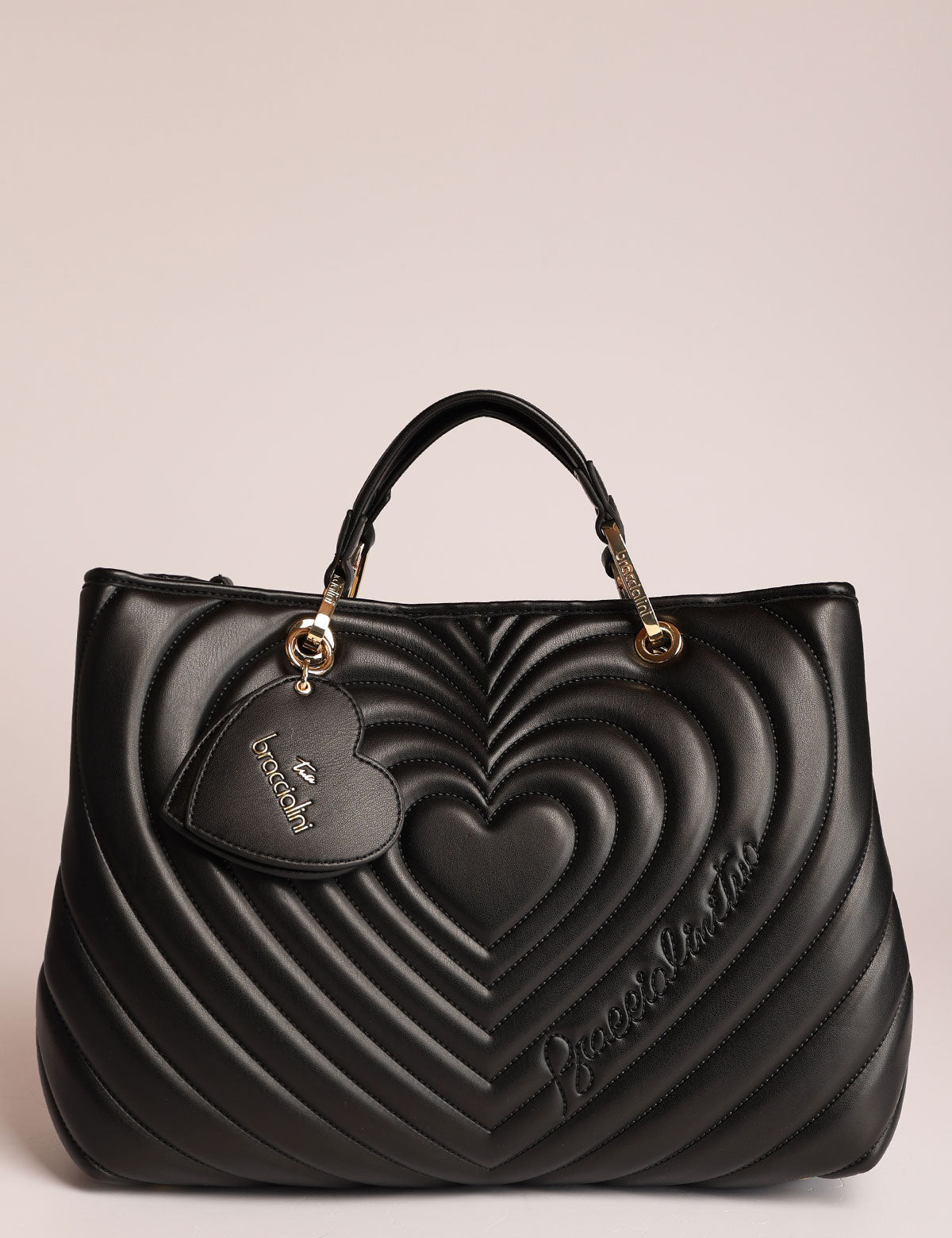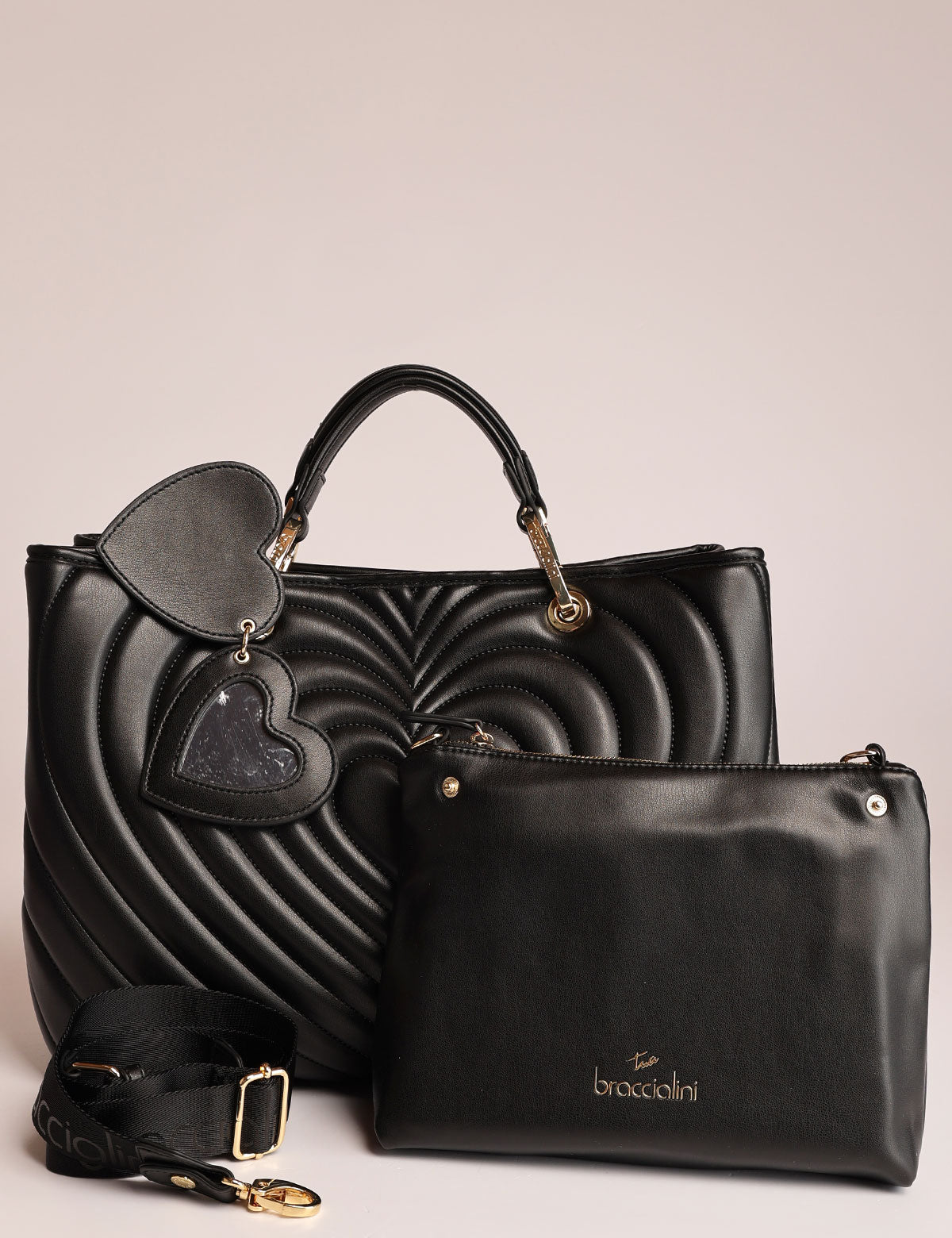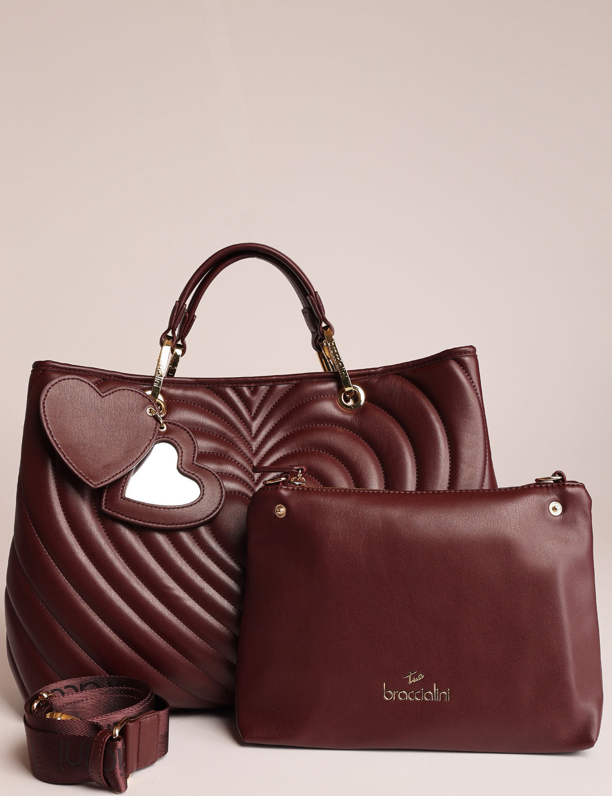 Braccialini women's bag with a distinctive quilted finish and a heart-shaped charm with a mirror. This model features an internal pouch that can also be used as a separate shoulder bag.