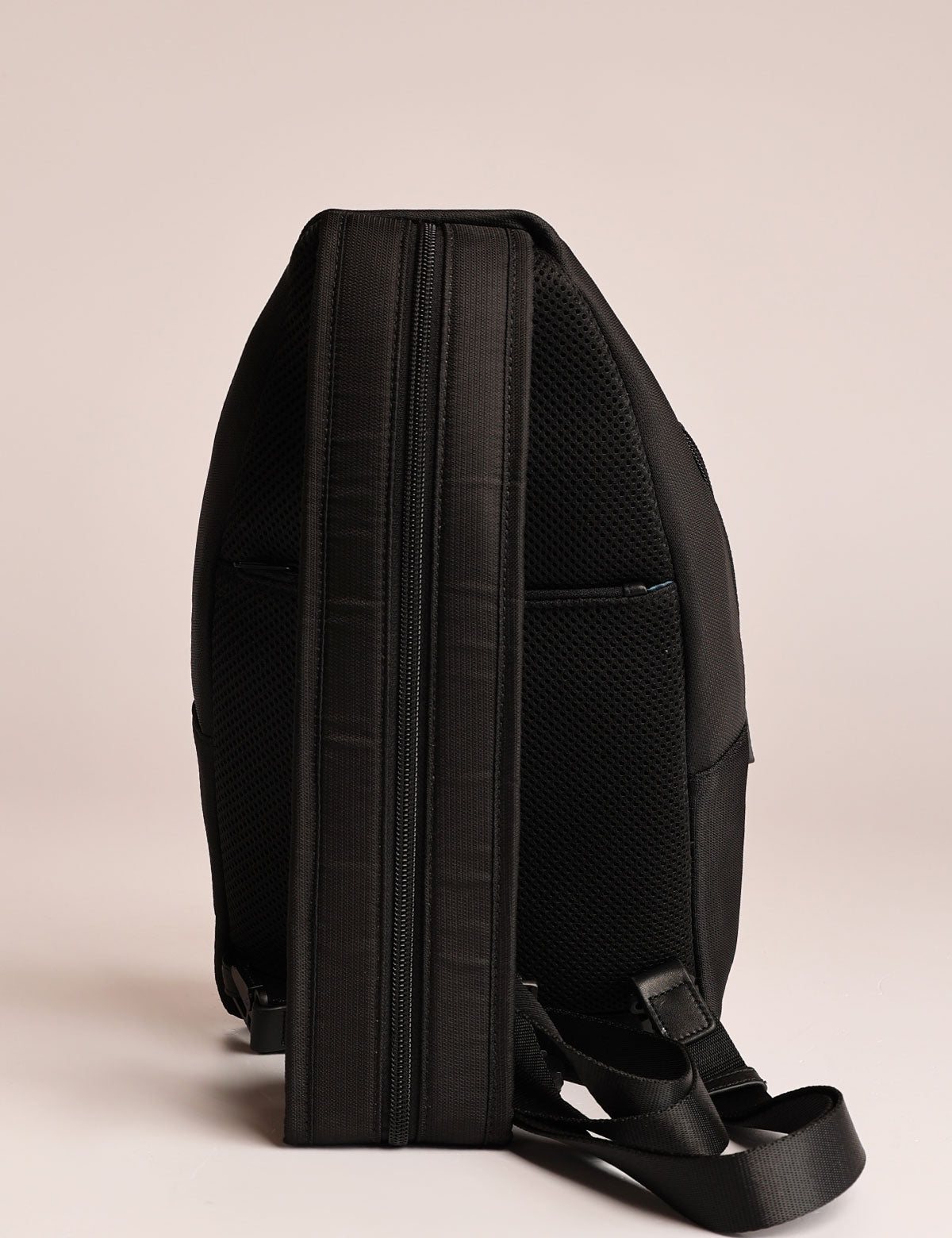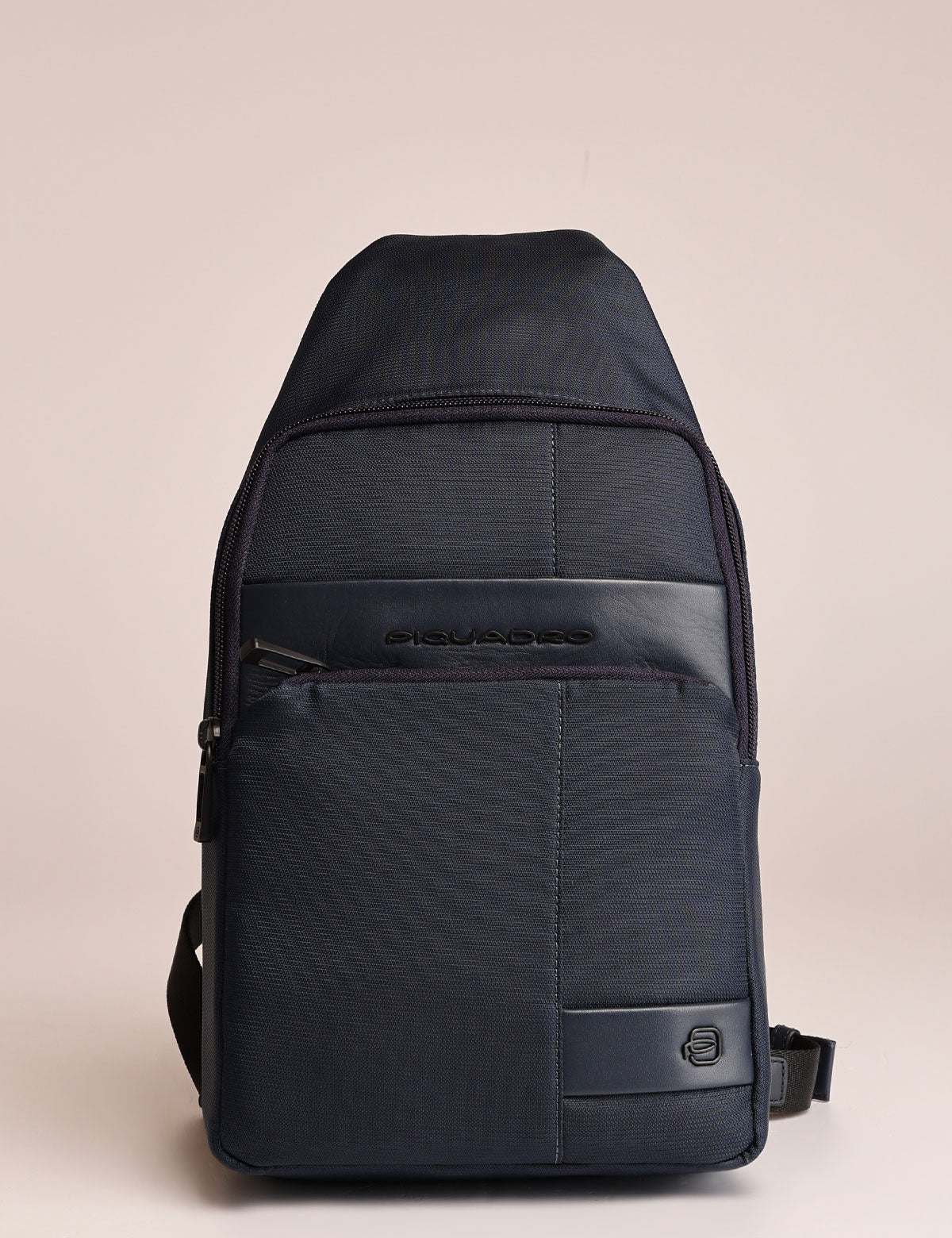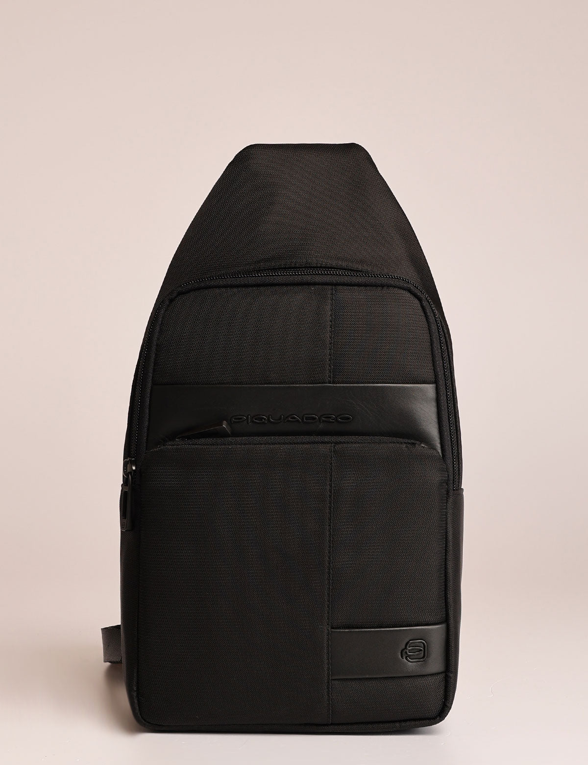 Piquadro men's single-shoulder bag with a zipped shoulder strap for backpack portability. Made from recycled technical fabric.