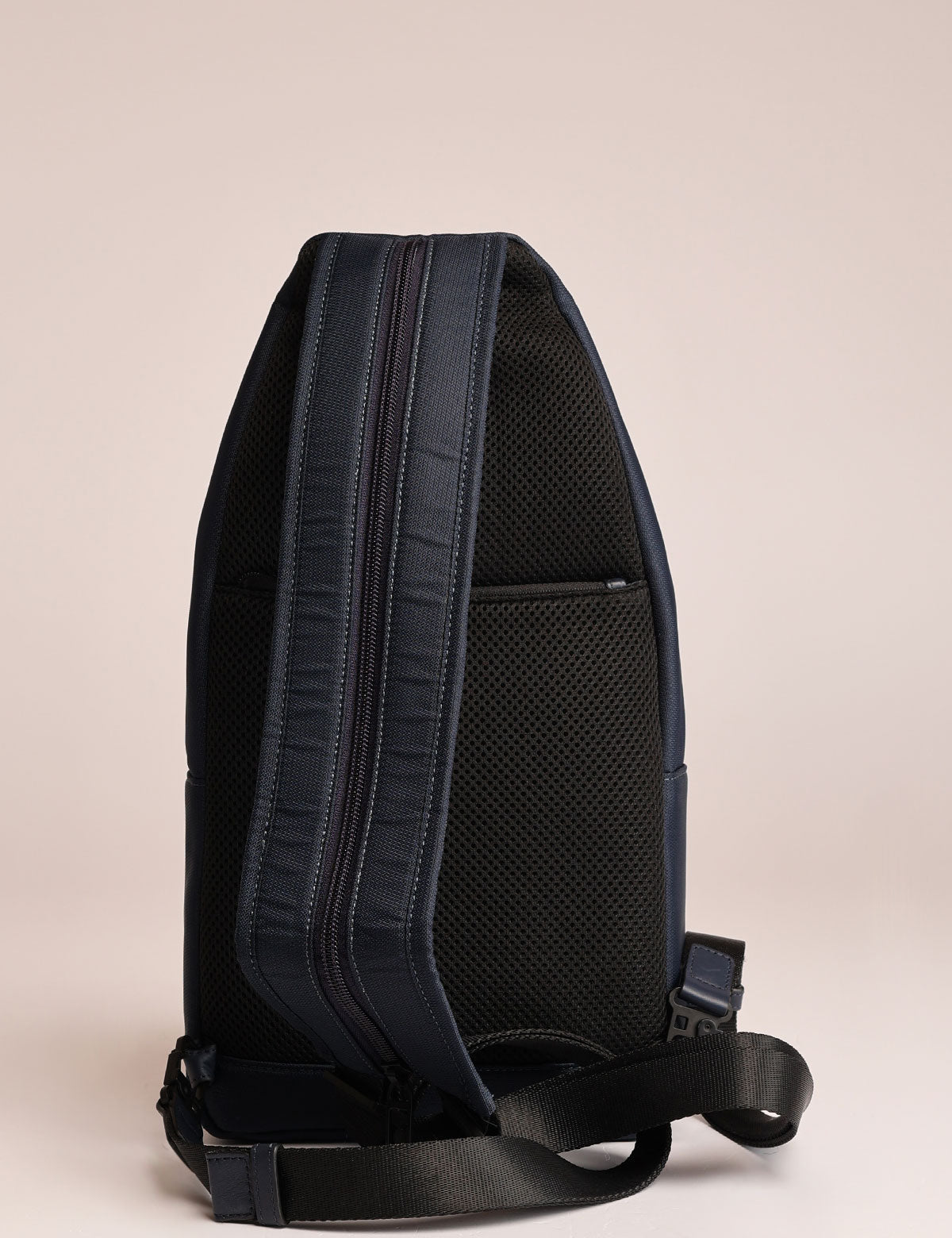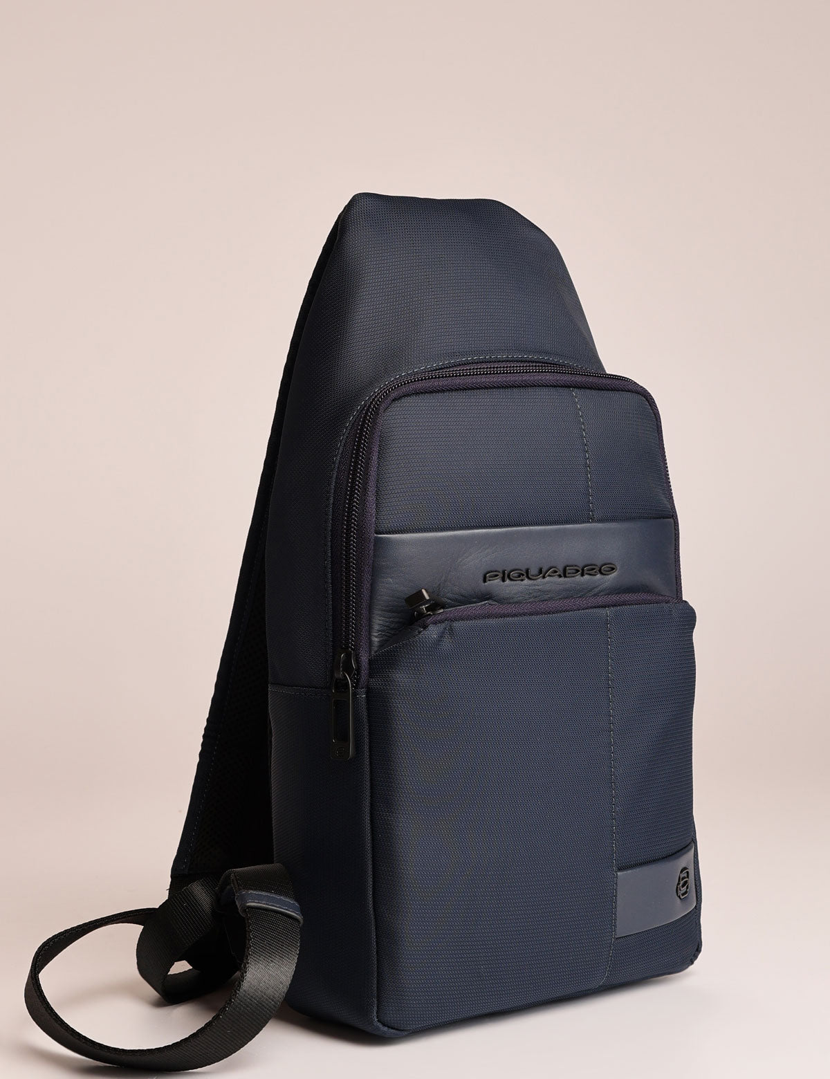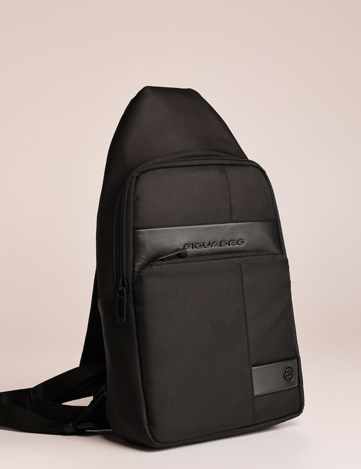 Piquadro men's single-shoulder bag with a zipped shoulder strap for backpack portability. Made from recycled technical fabric.