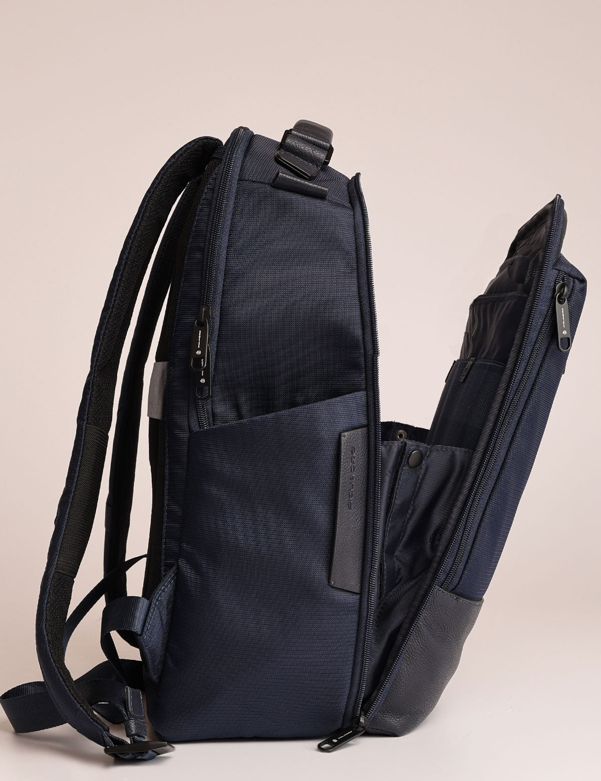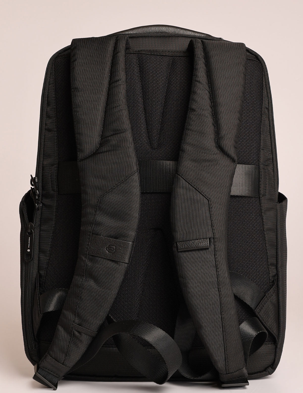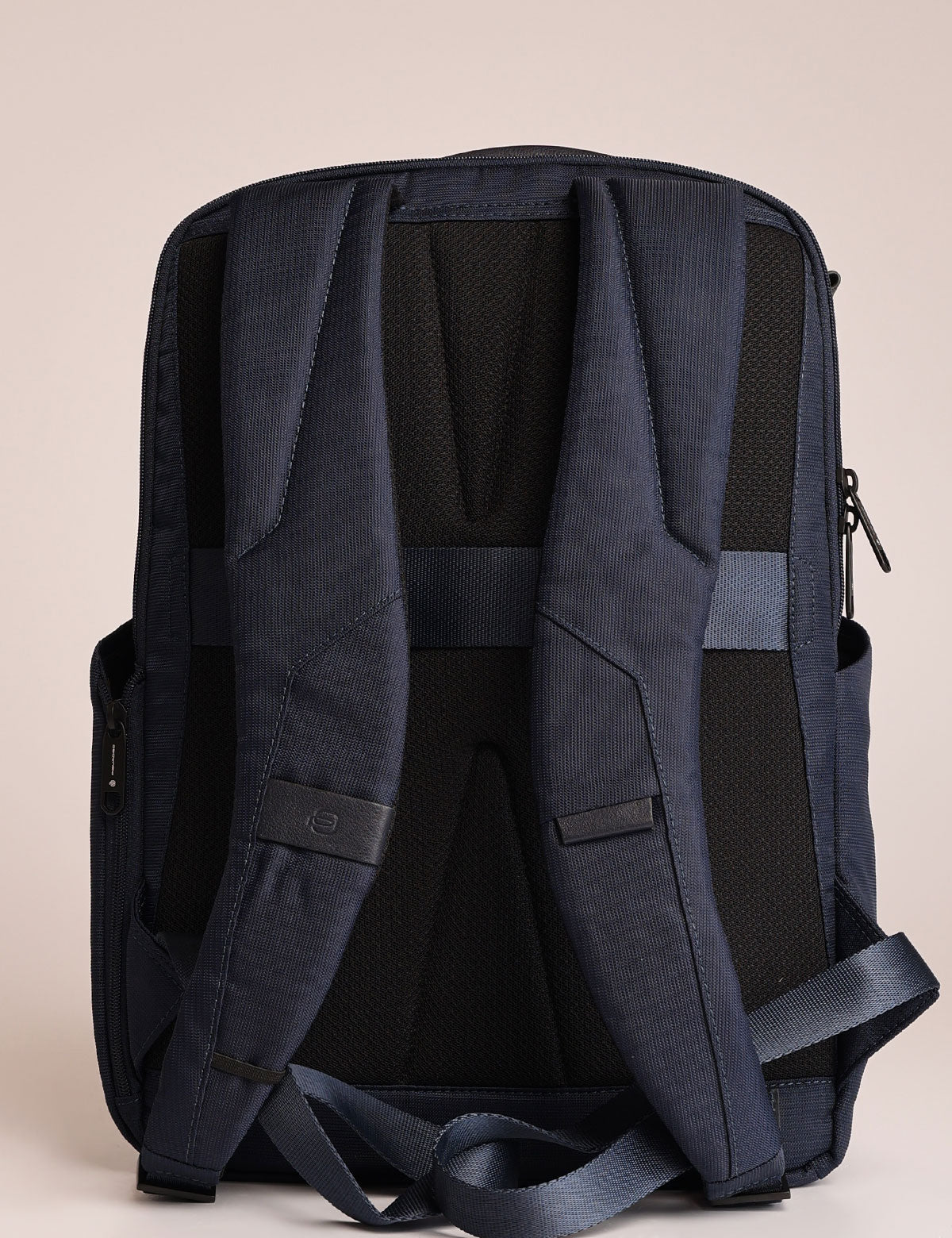 Piquadro travel backpack with shock-absorbing 15.6" laptop compartment and large compartment with garment straps. Underseat model for Easyjet.