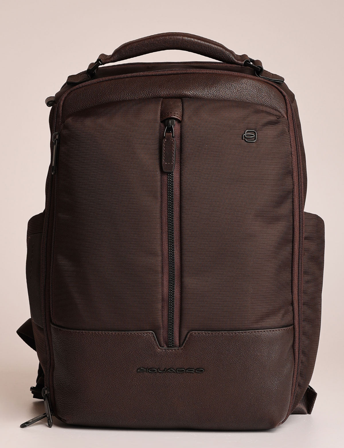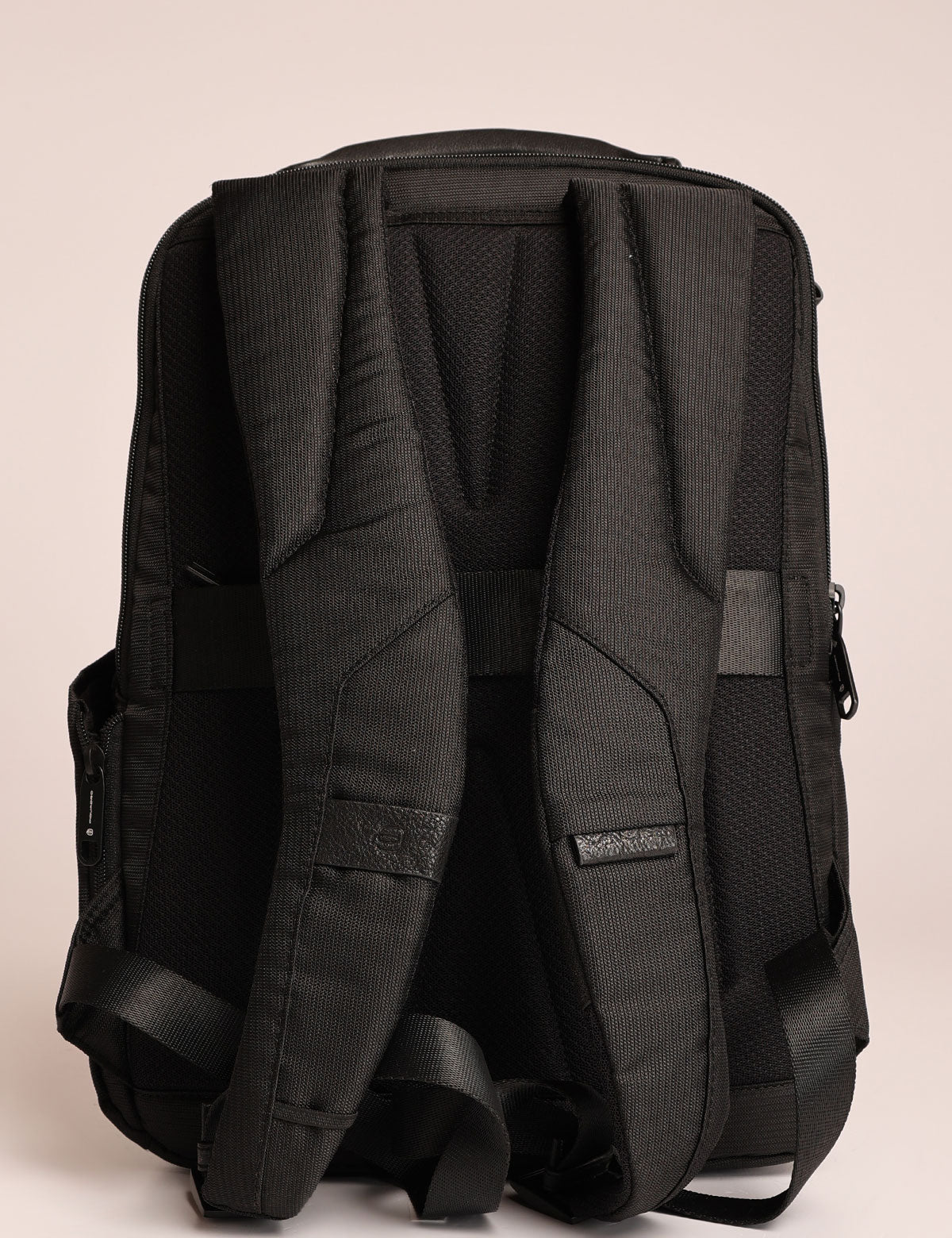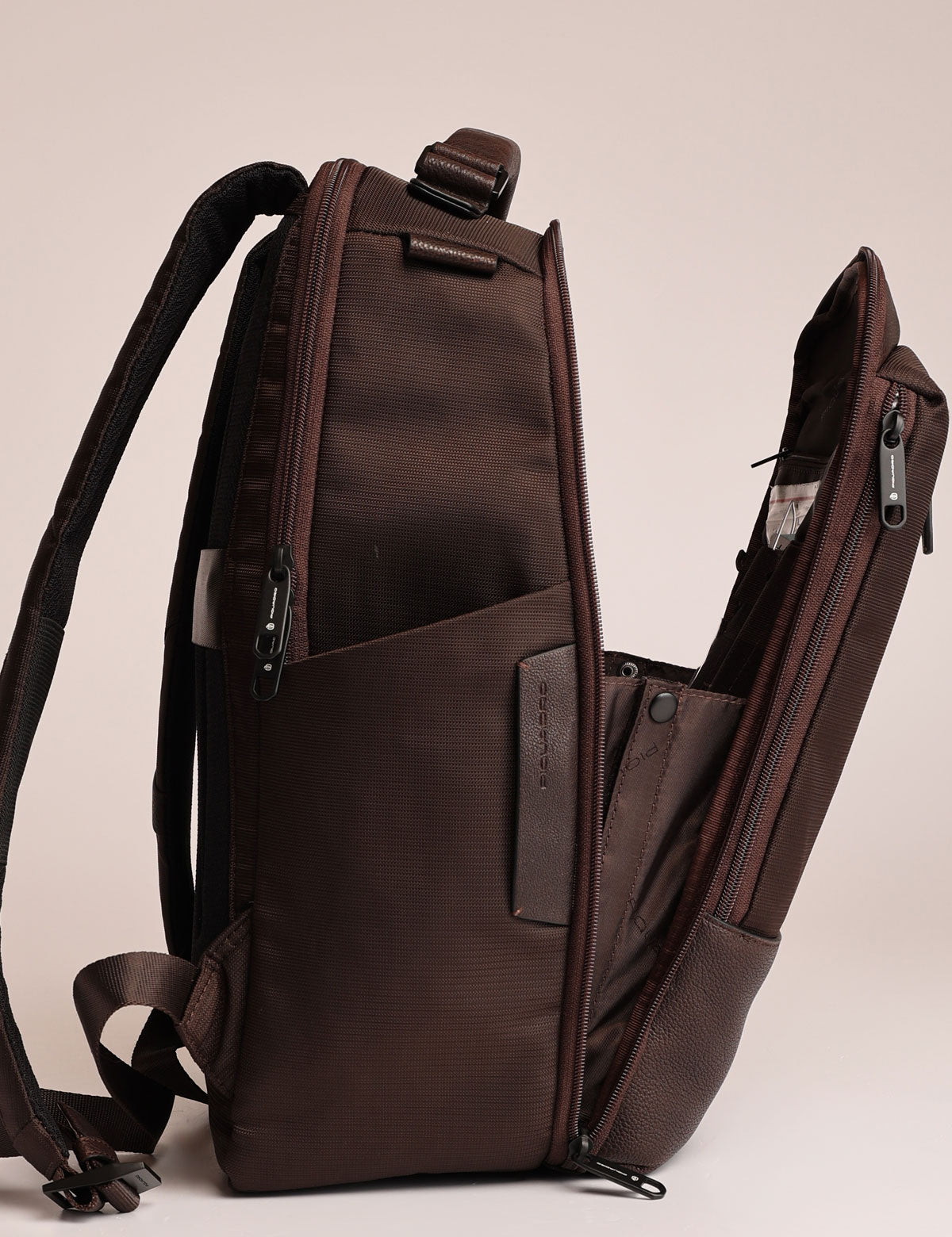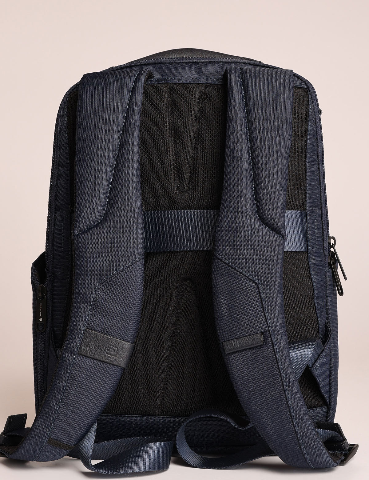 Piquadro travel backpack with shock-absorbing 14" laptop compartment and large compartment with garment straps. Underseat model for all airlines.