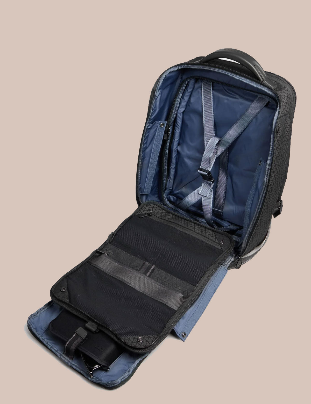 Ma il cuore della collezione è il tessuto tecnico esclusivo, ispirato al reticolo molecolare del carbonio: leggero, idrorepellente e resistente a urti, usura e intemperie. Realizzato con 91% di poliestere riciclato e rifinito in poliuretano con inserti in pelle di alta qualità, rappresenta l’impegno di Piquadro verso un’innovazione sostenibile e raffinata.